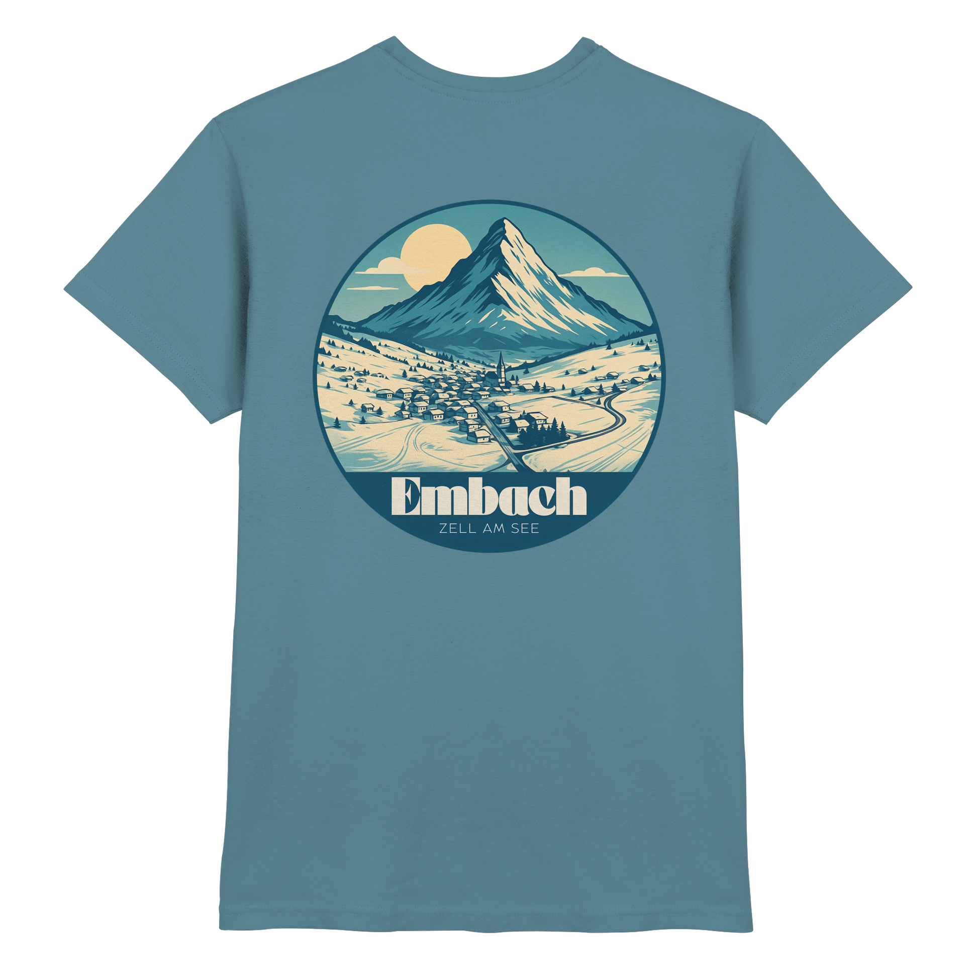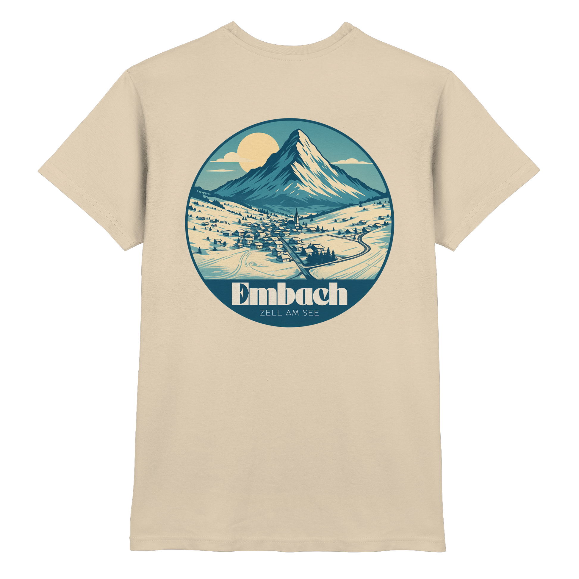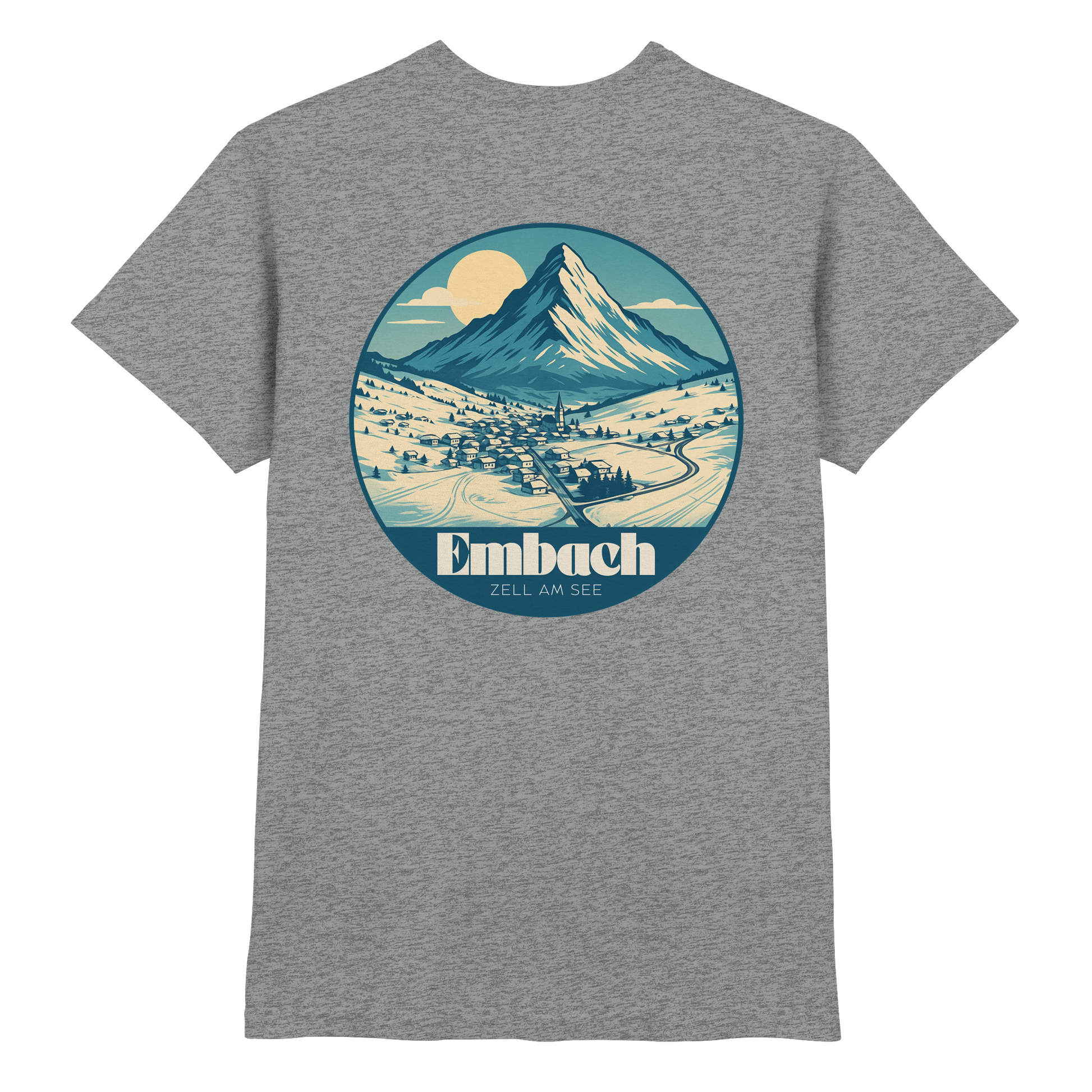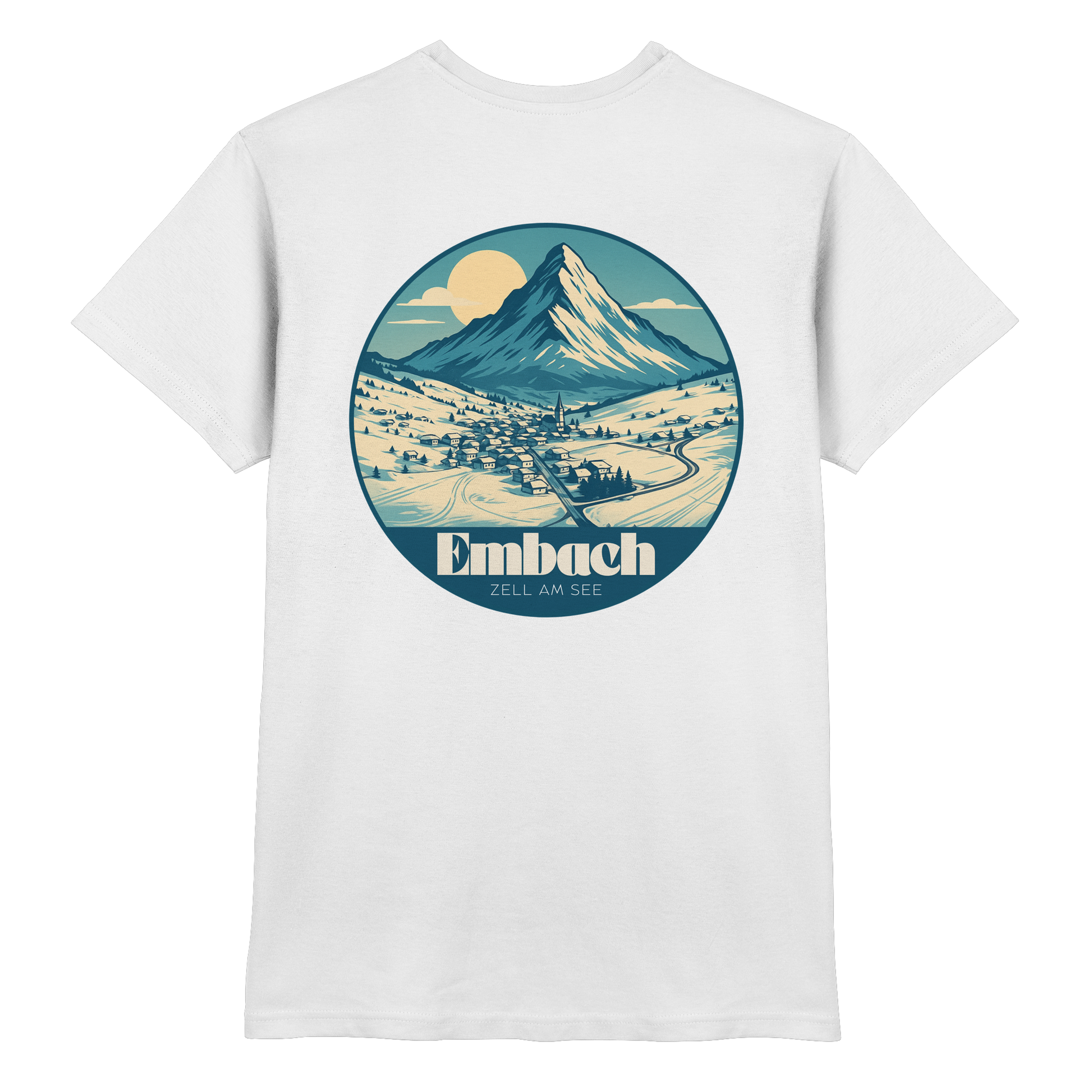 Das „Alpine Dawn“ Shirt trägt auf der Brust den dezenten Embach-Schriftzug mit Berg, auf der Rückseite das verschneite Bergdorf.