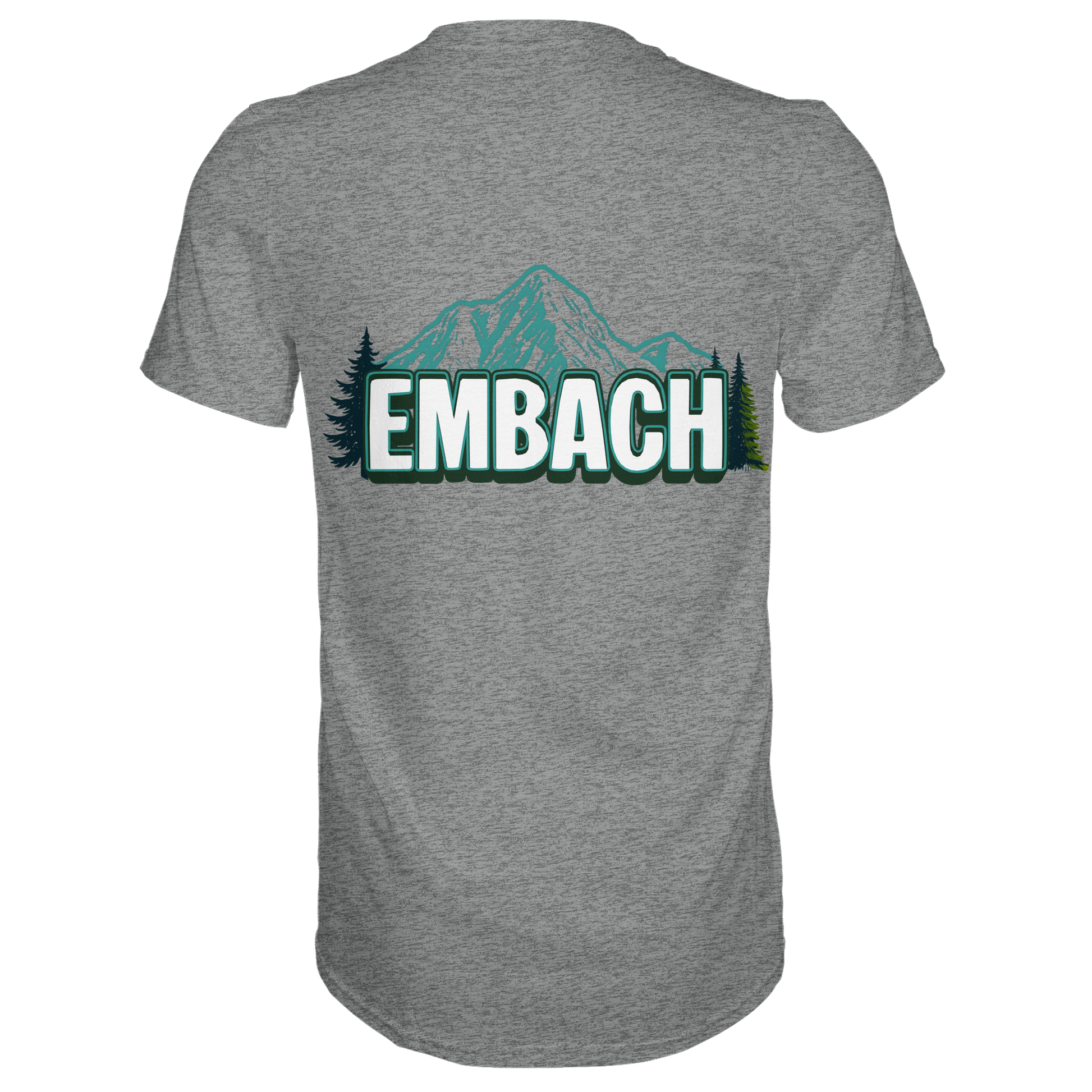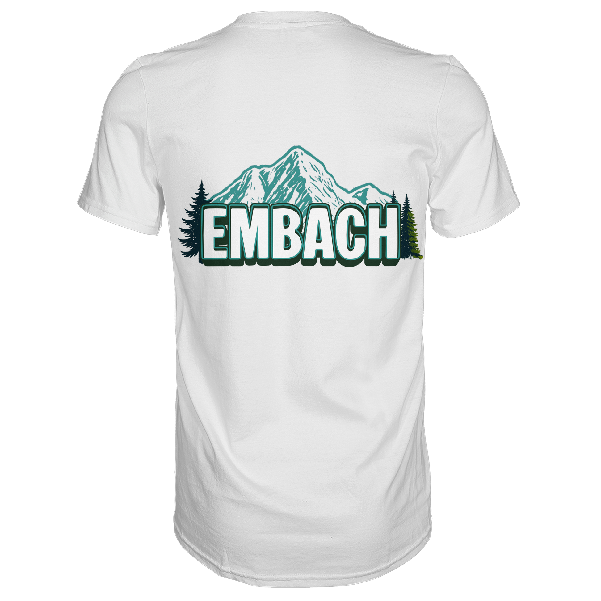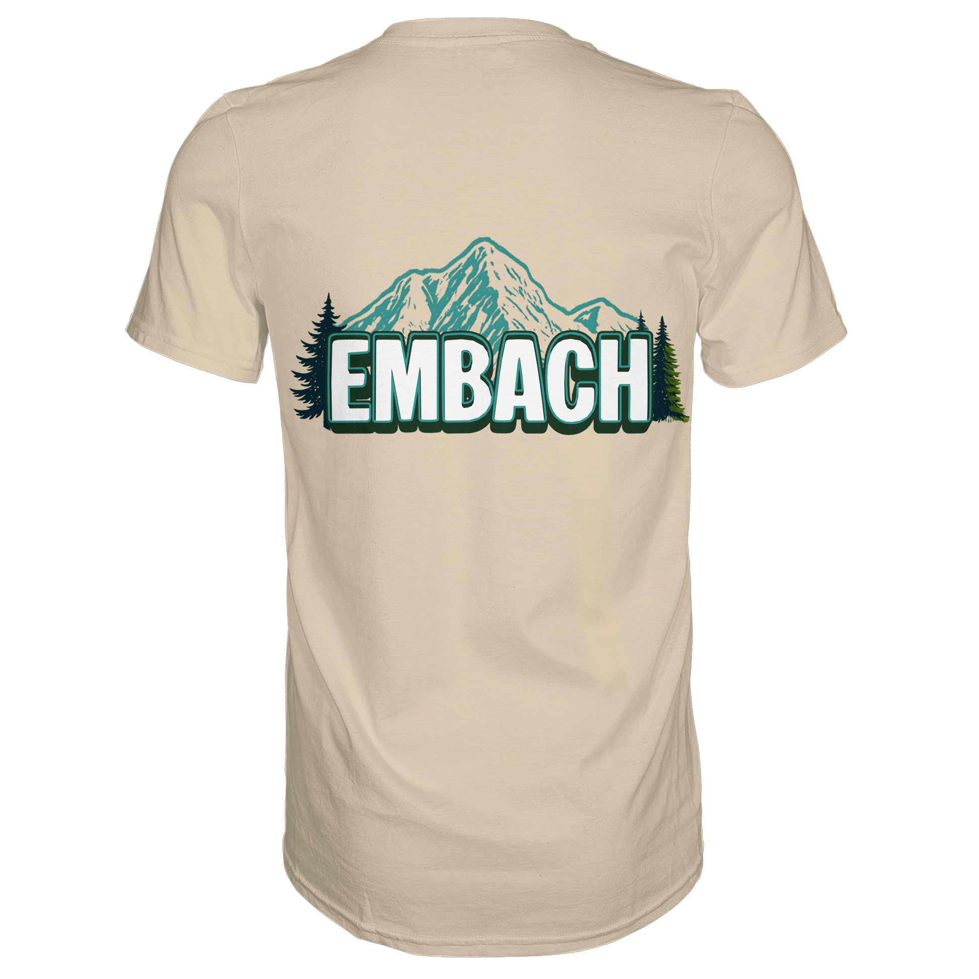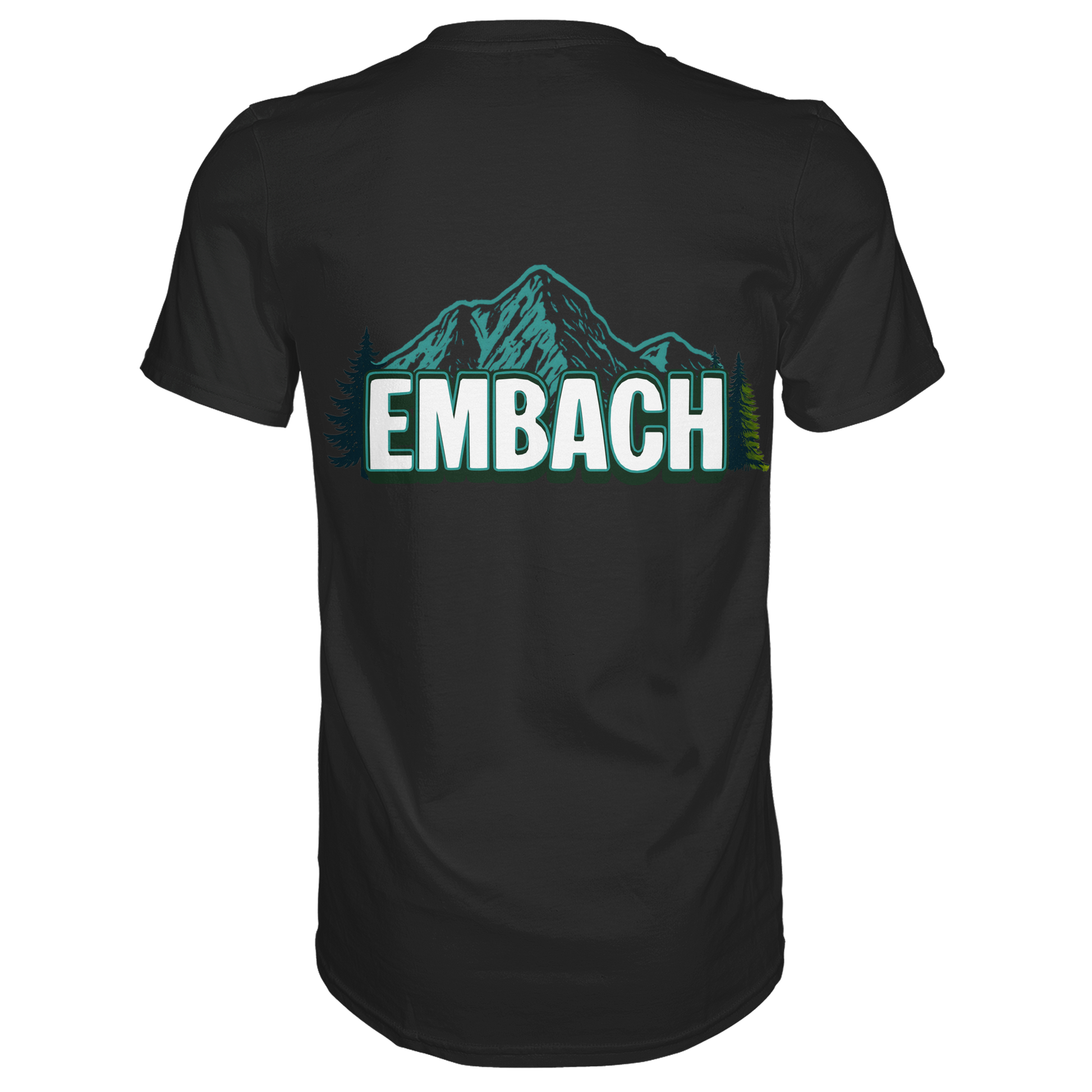 Vorne das Panorama, hinten der Stolz: Das Shirt zeigt auf der Vorderseite das Bergmotiv mit Wanderer – Sinnbild für Freiheit, Natur und das Gefühl, in Embach anzukommen. Auf der Rückseite steht klar und ruhig der Schriftzug „EMBACH“.