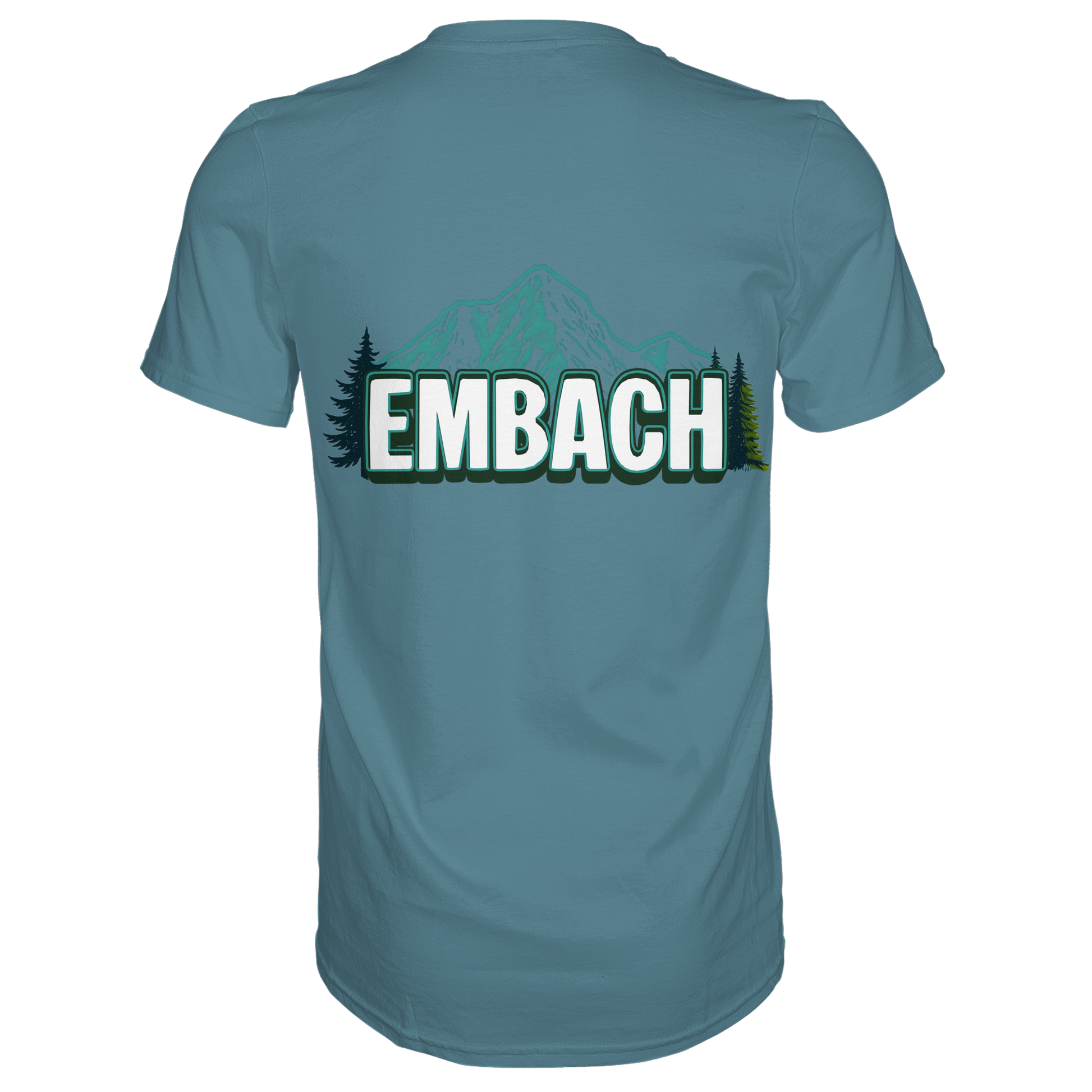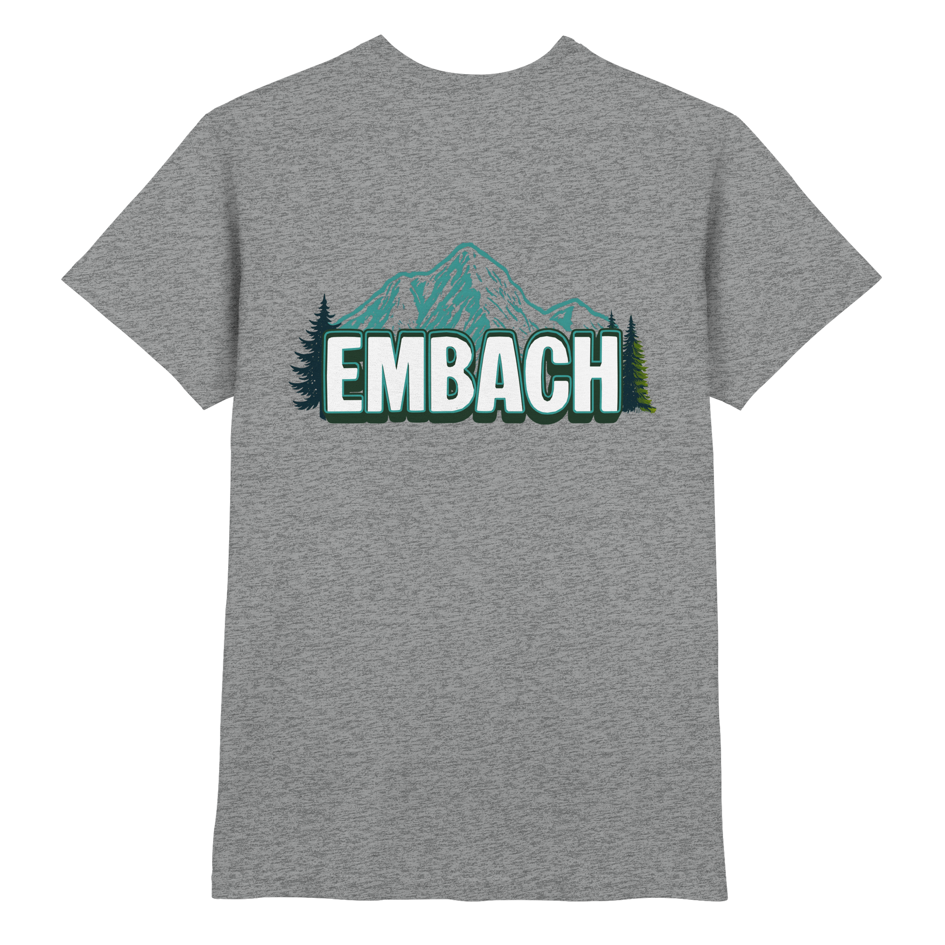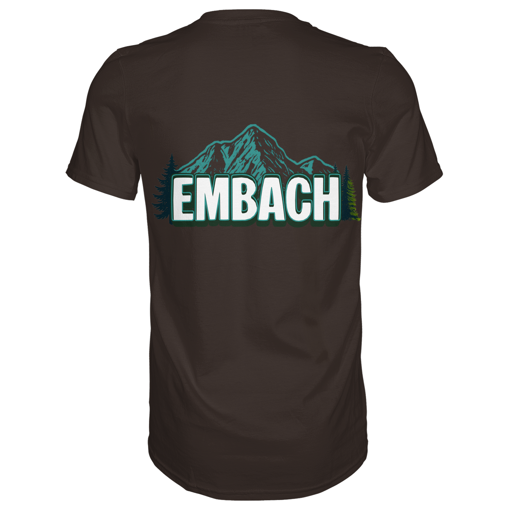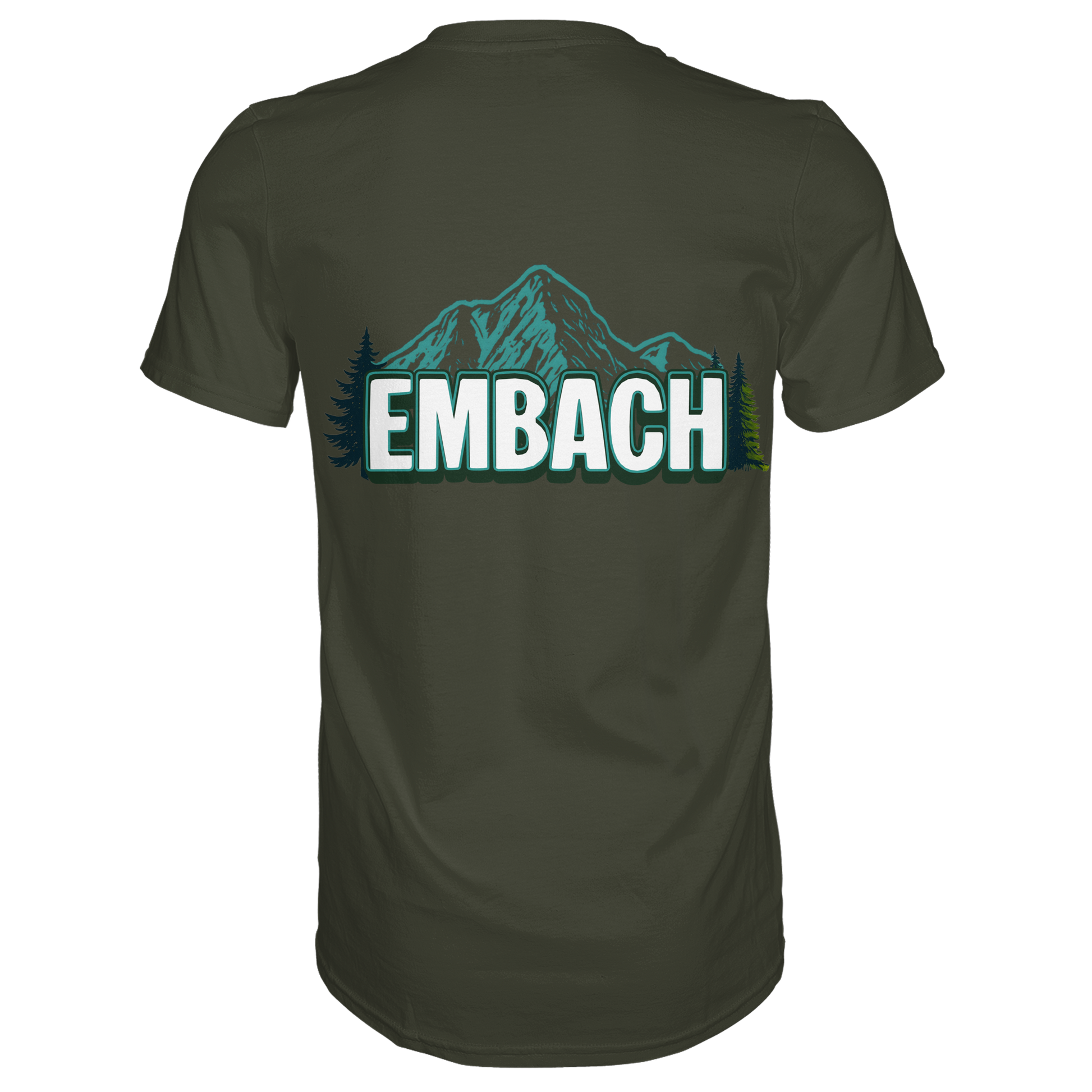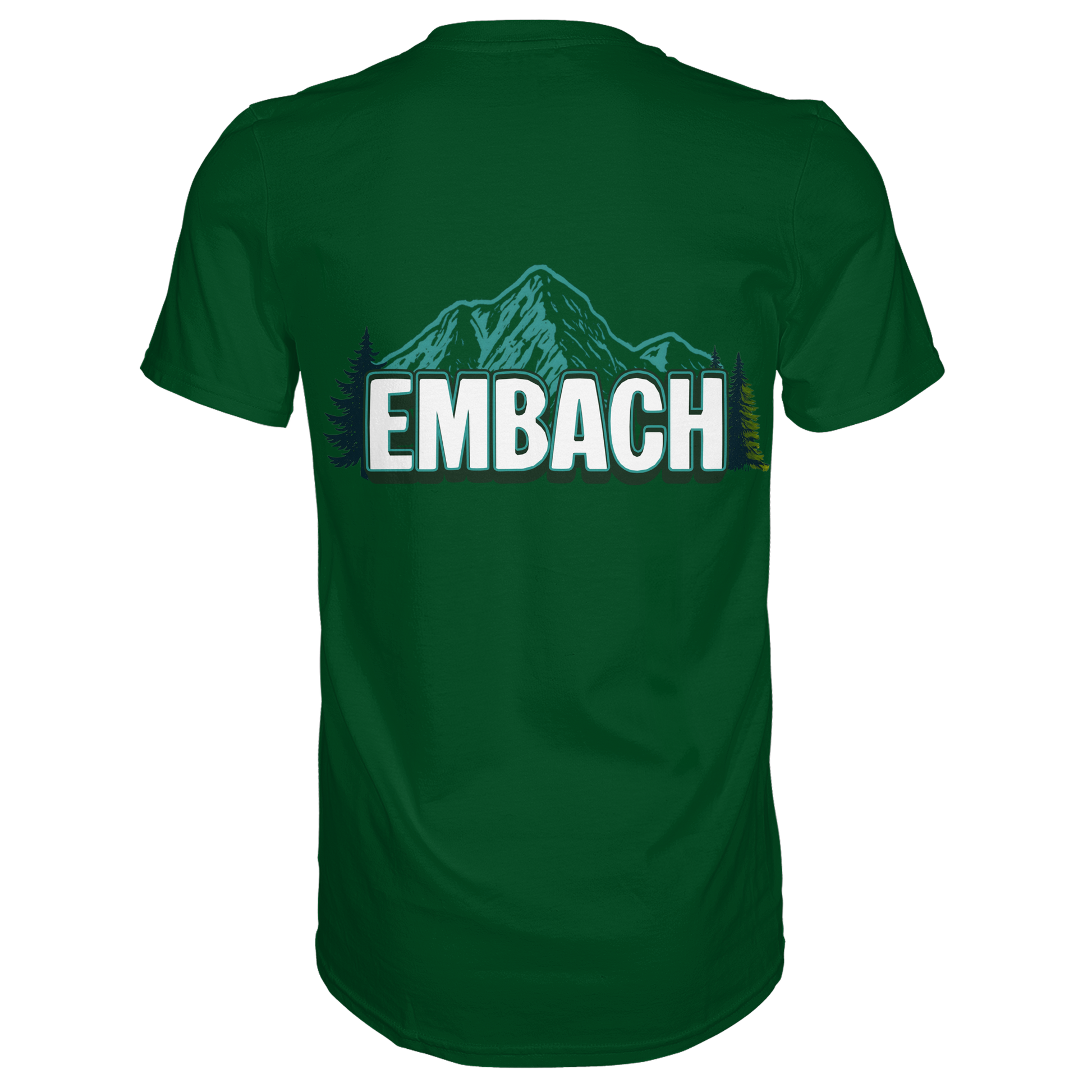 Vorne das Panorama, hinten der Stolz: Das Shirt zeigt auf der Vorderseite das Bergmotiv mit Wanderer – Sinnbild für Freiheit, Natur und das Gefühl, in Embach anzukommen. Auf der Rückseite steht klar und ruhig der Schriftzug „EMBACH“.
