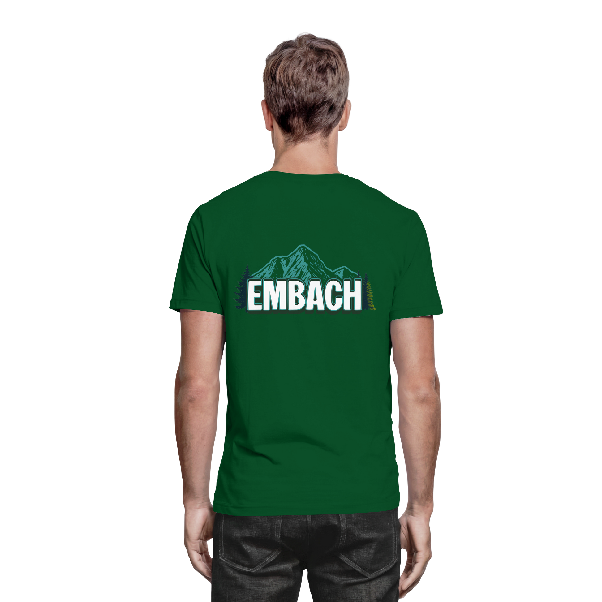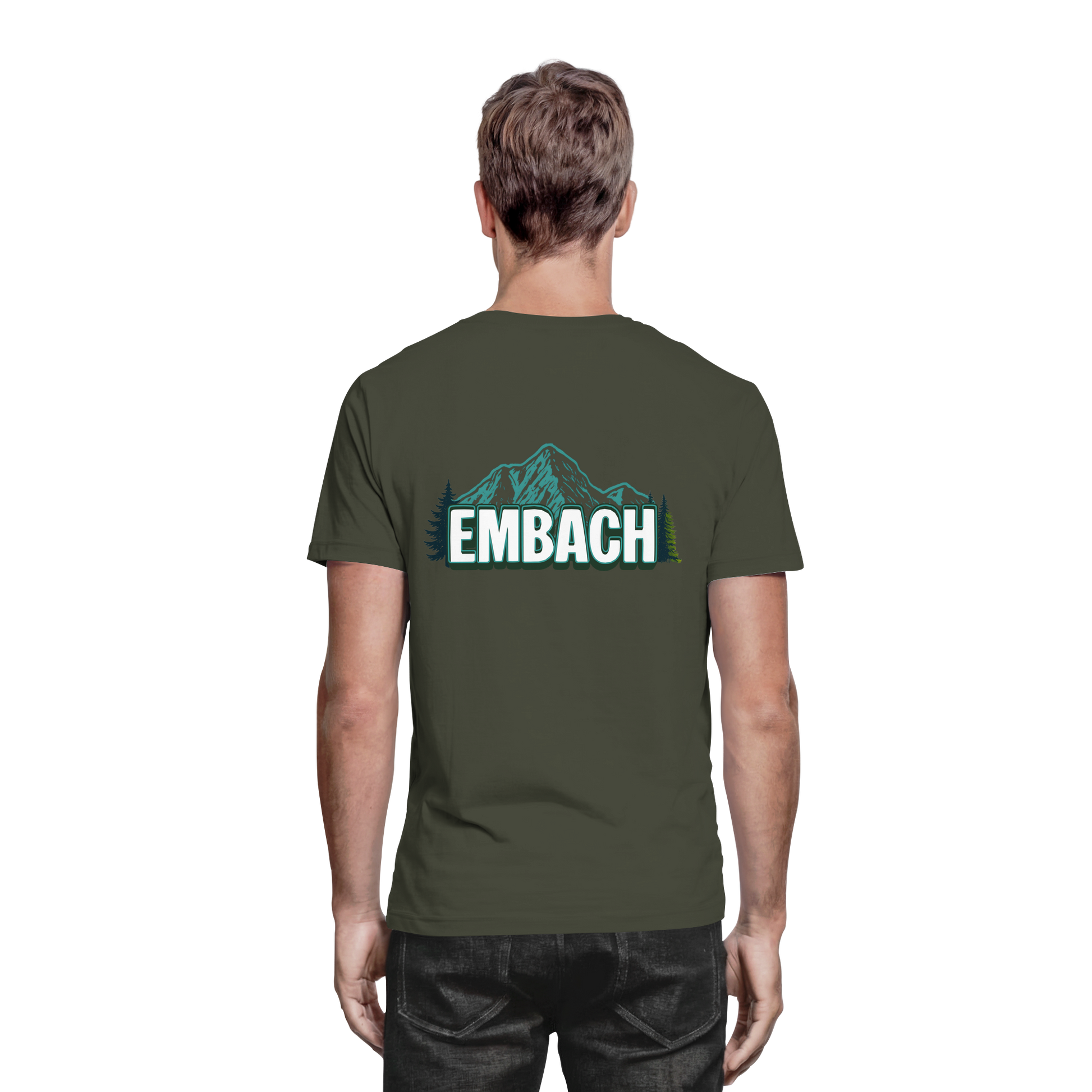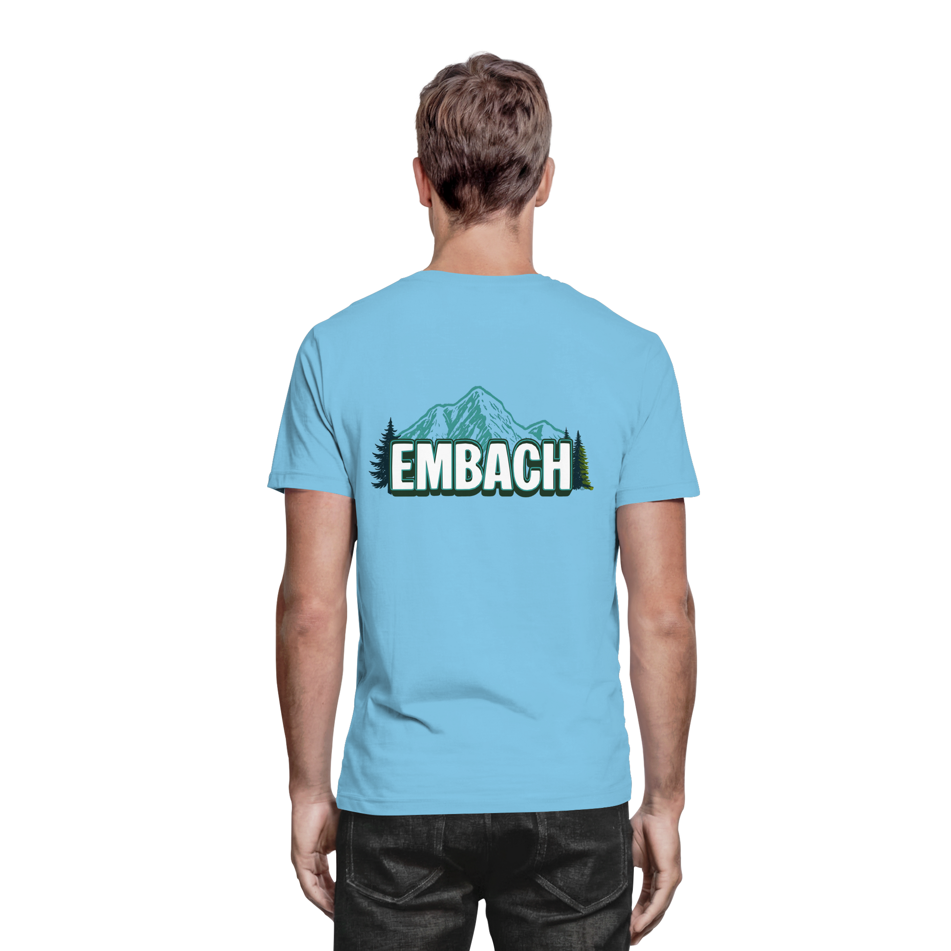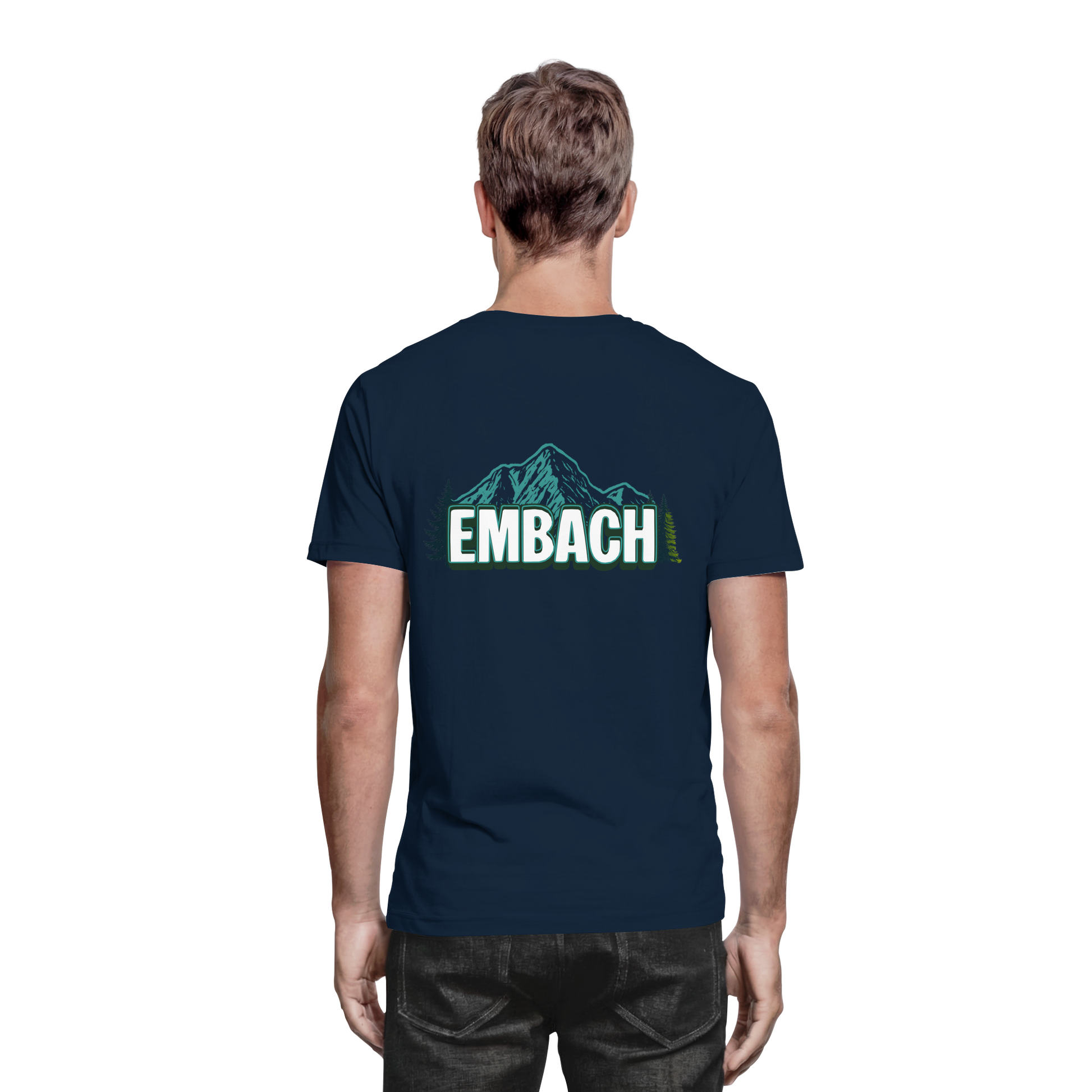 Vorne das Panorama, hinten der Stolz: Das Shirt zeigt auf der Vorderseite das Bergmotiv mit Wanderer – Sinnbild für Freiheit, Natur und das Gefühl, in Embach anzukommen. Auf der Rückseite steht klar und ruhig der Schriftzug „EMBACH“.