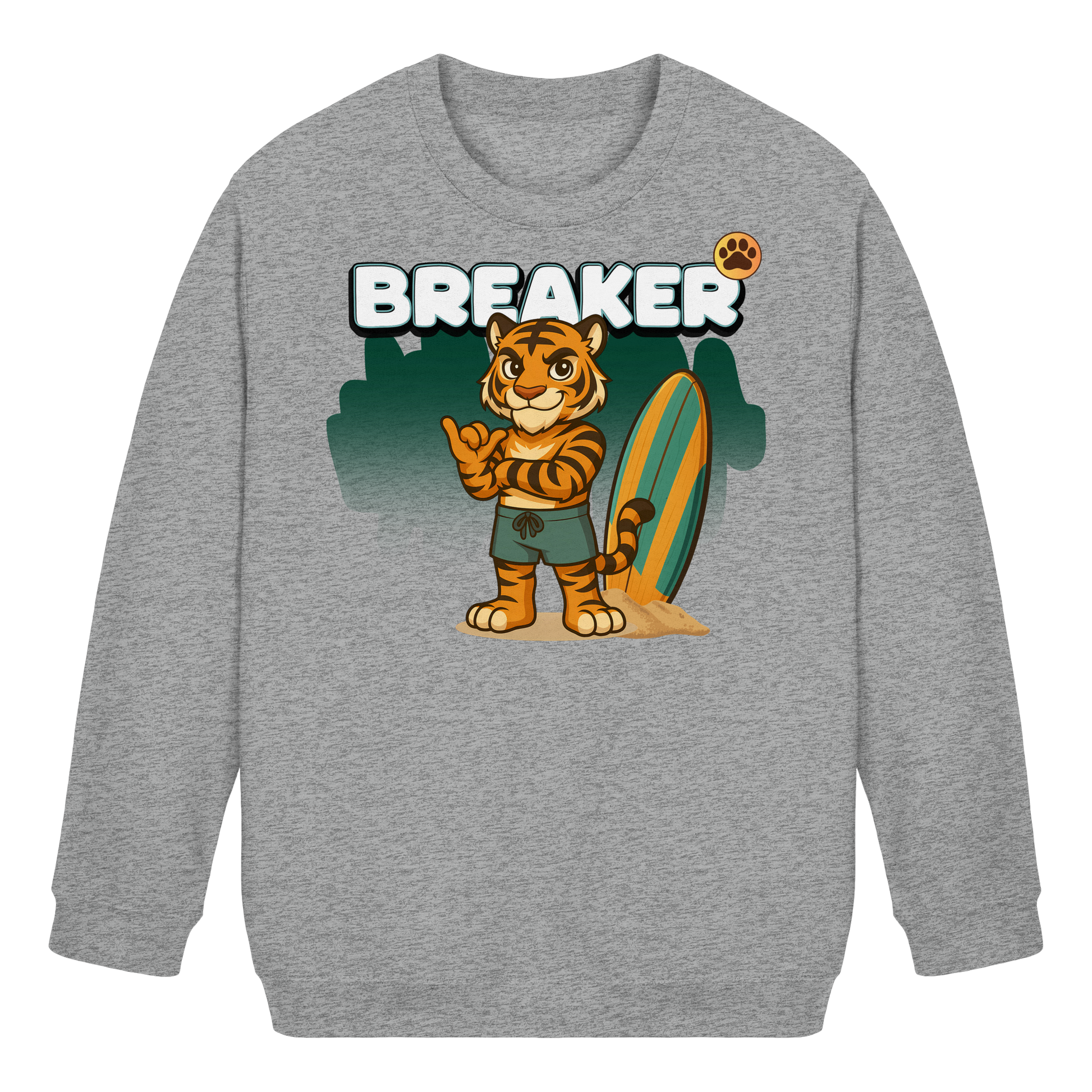 Breaker Sweatshirt – Tiger mit Surfbrett und jeder Menge Sommer-Feeling. Warm, bequem und trotzdem voller Action. Teil der Wild Crew und perfekt für Kids mit Energie.