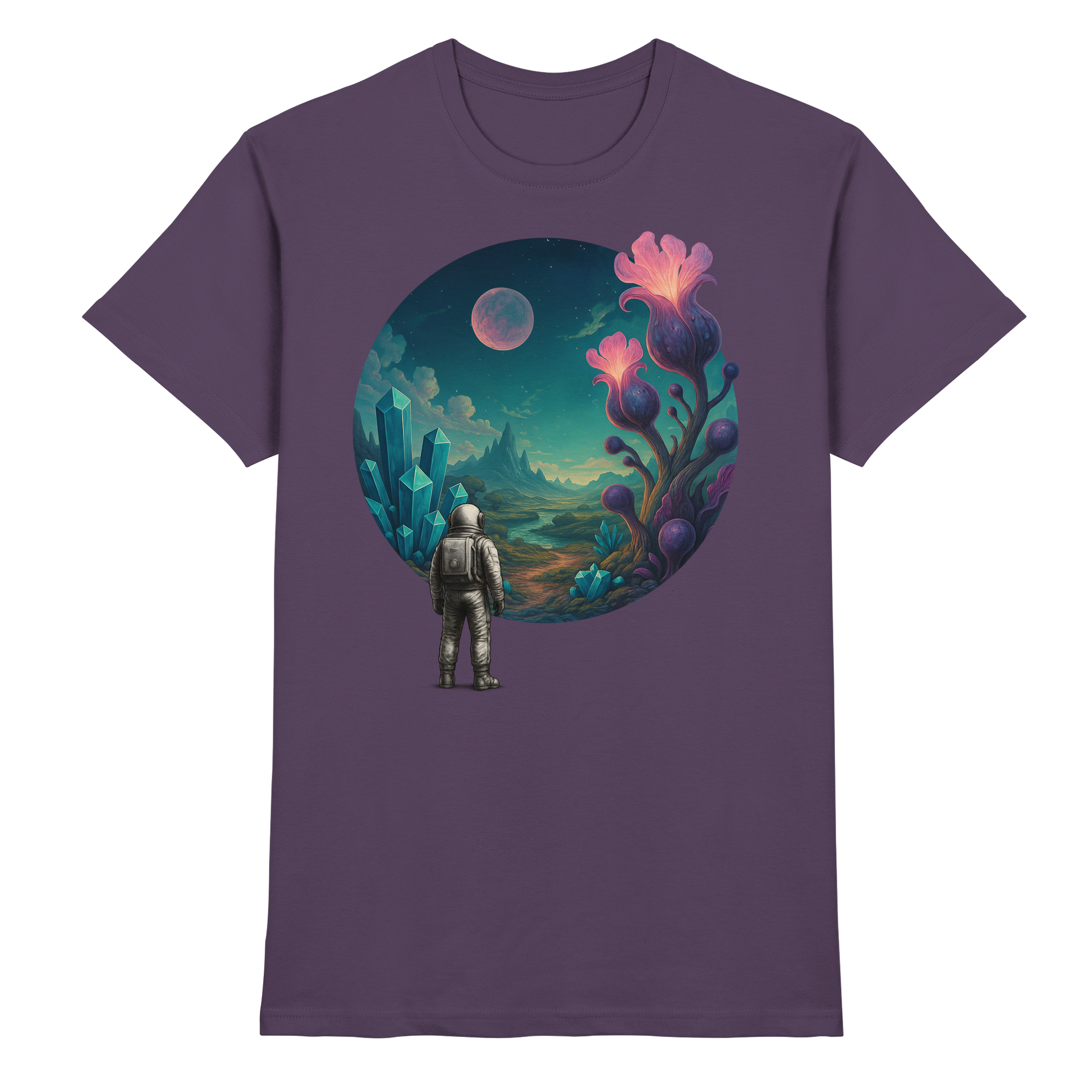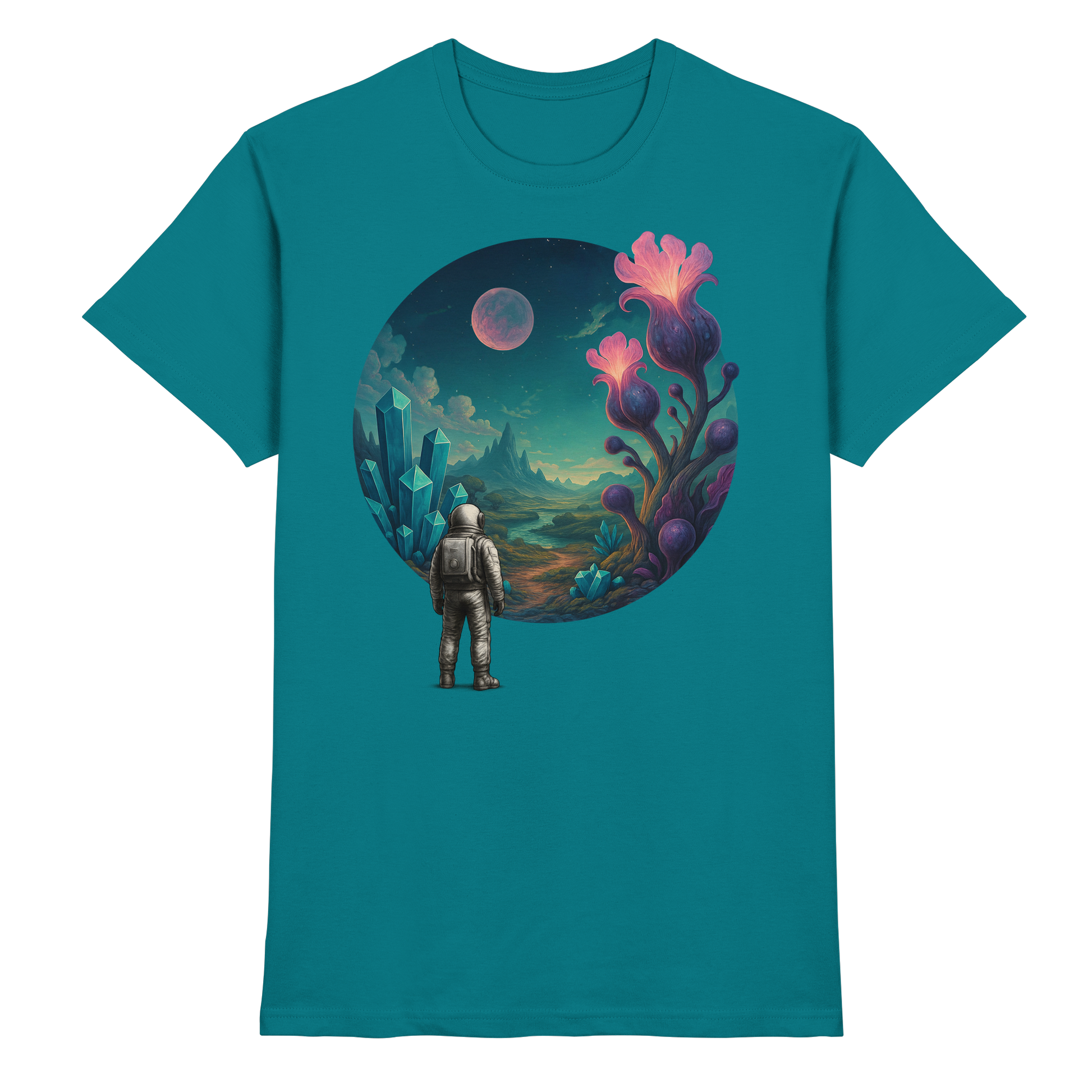 Ein Astronaut steht vor einer Welt voller Kristalle und fremder Pflanzen. Crystal Bloom bringt die Magie eines anderen Planeten direkt auf dein Shirt. Teil der Serie Astronaut’s Journey – eine Reise ins Unbekannte.