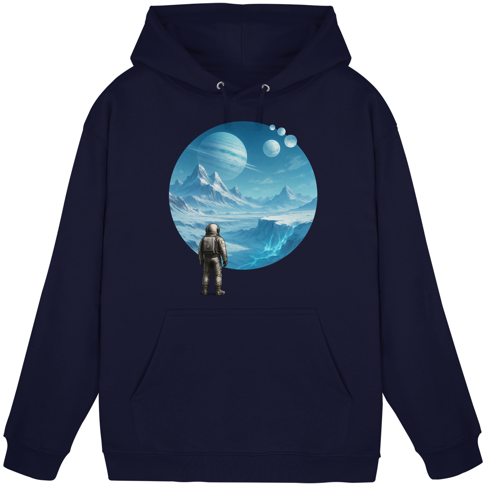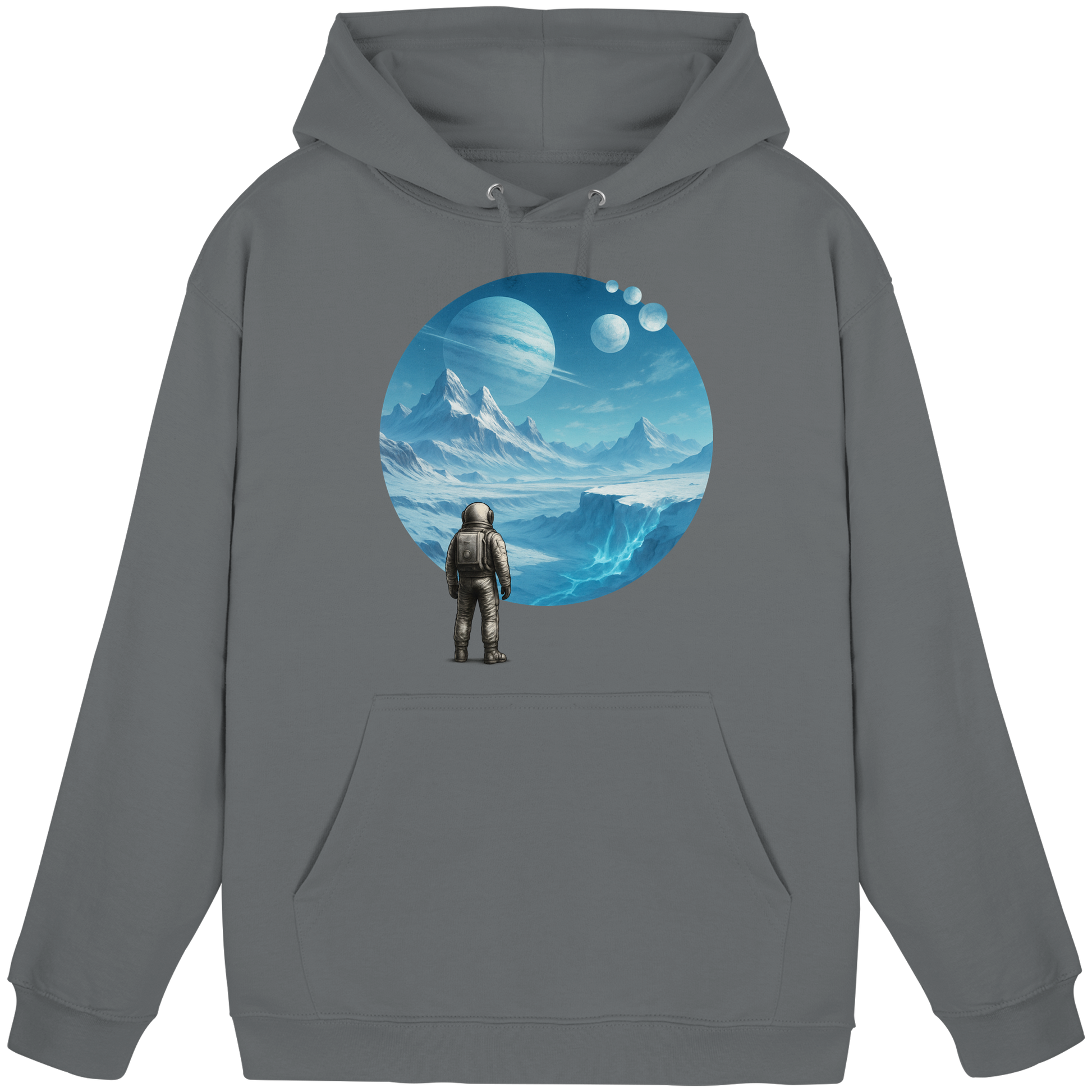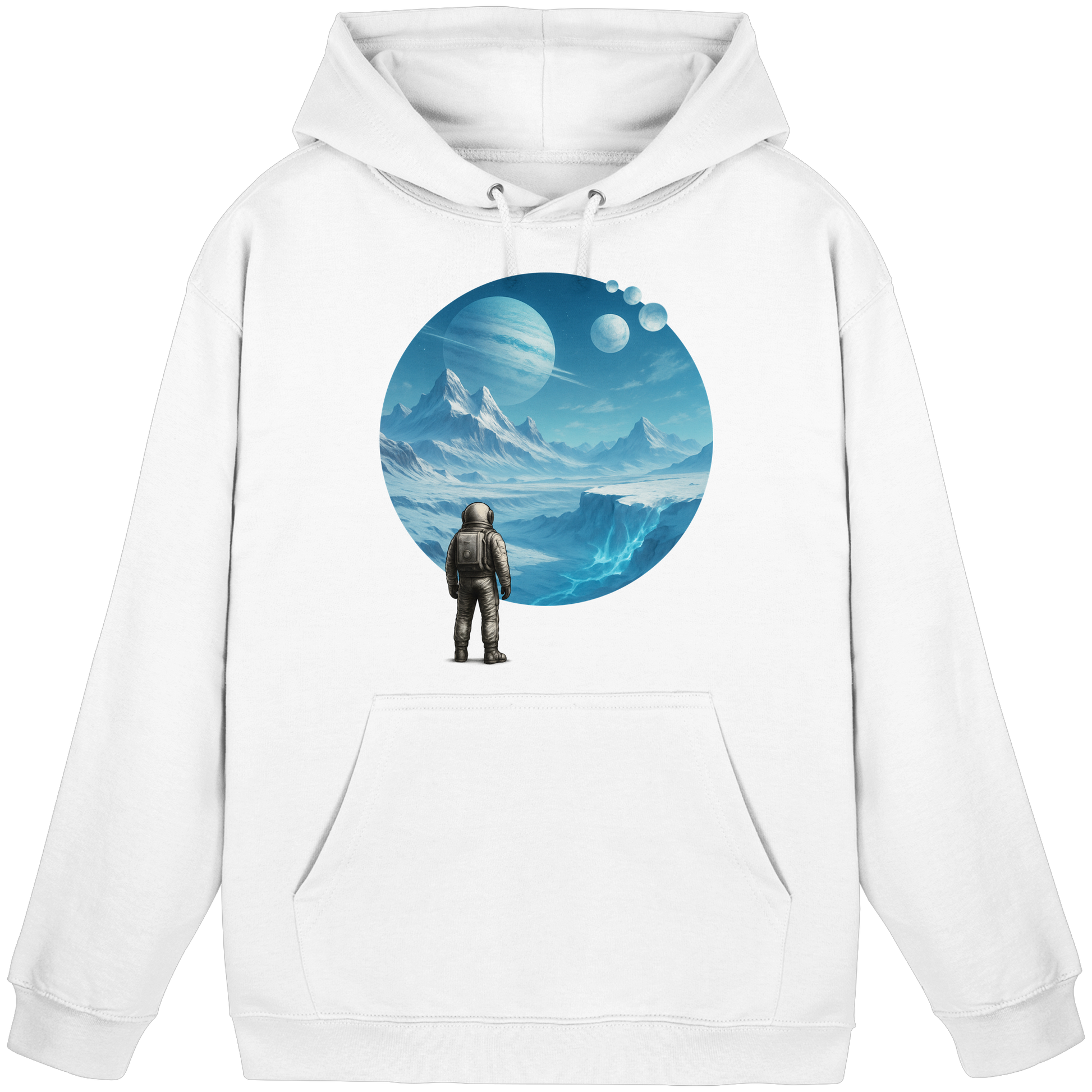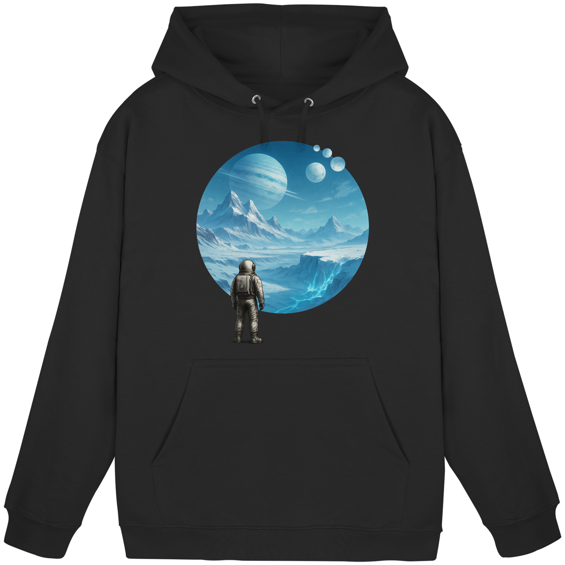 Ein Hoodie wie eine Eiswelt. Frozen Expanse zeigt einen Astronauten auf einem frostigen Planeten mit fernen Monden. Teil der Serie Astronaut’s Journey – Sci-Fi für kalte Tage.