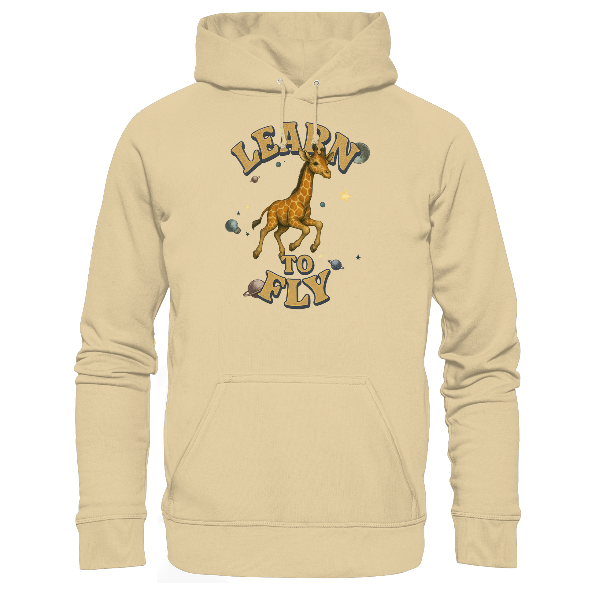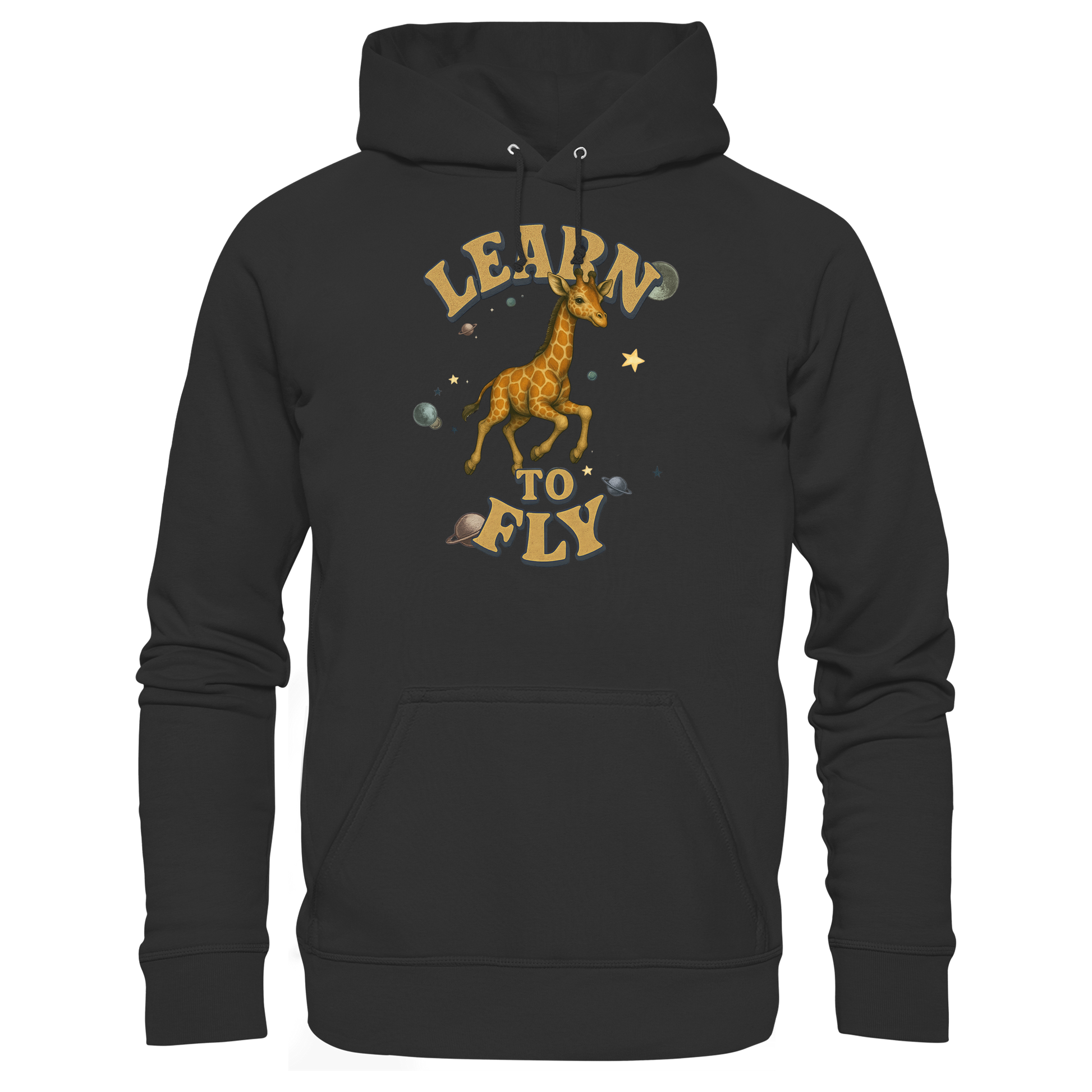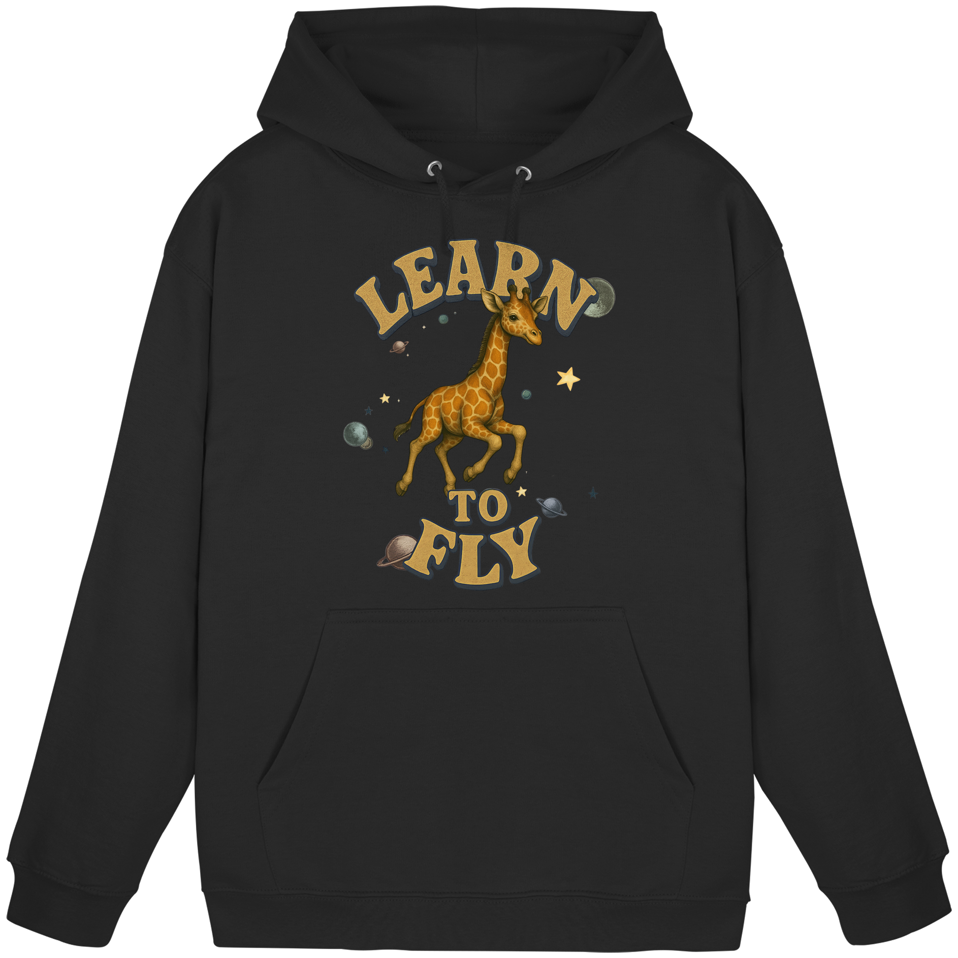 Eine Giraffe zwischen Sternen und Planeten – fliegen wird sie nie, doch genau das macht den Hoodie so stark. Learn To Fly ist eine Serie über Druck, Freiheit und Humor. Perfekt für alle, die auffallen wollen. Teil einer Kollektion mit weiteren Tiermotiven.