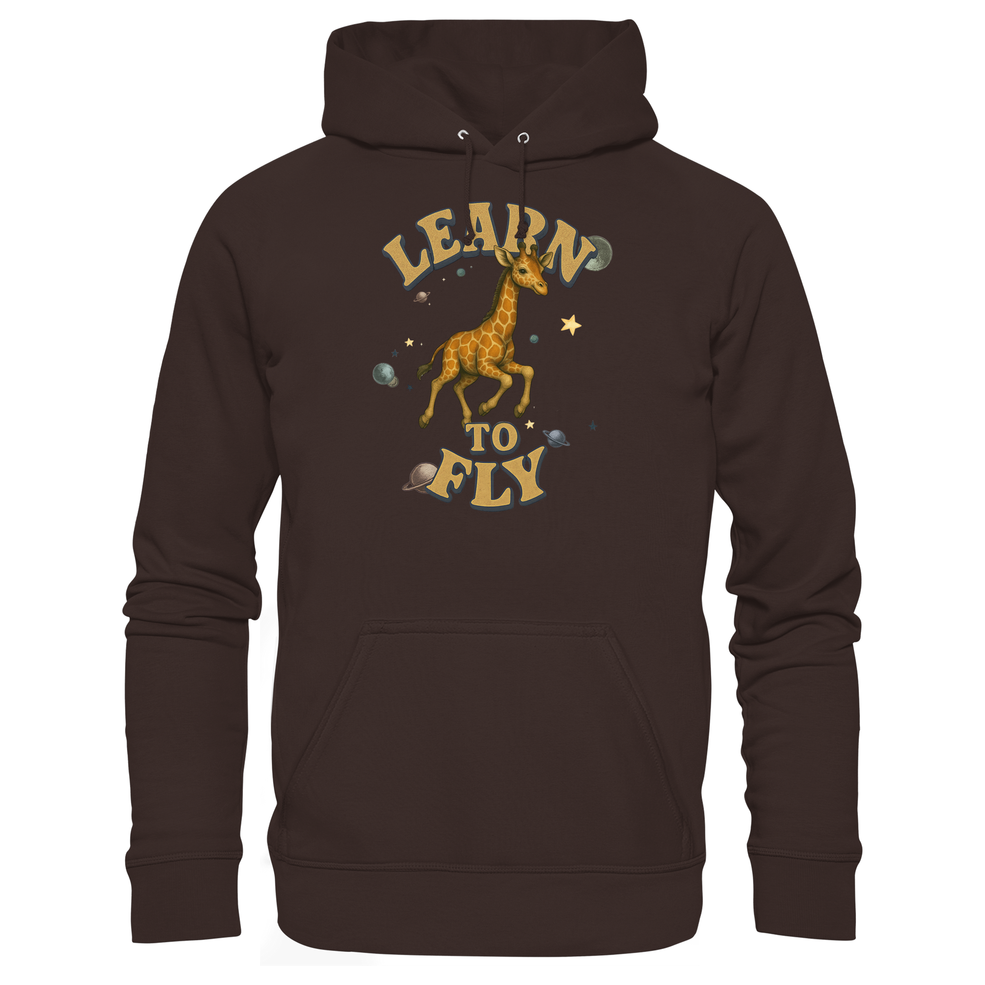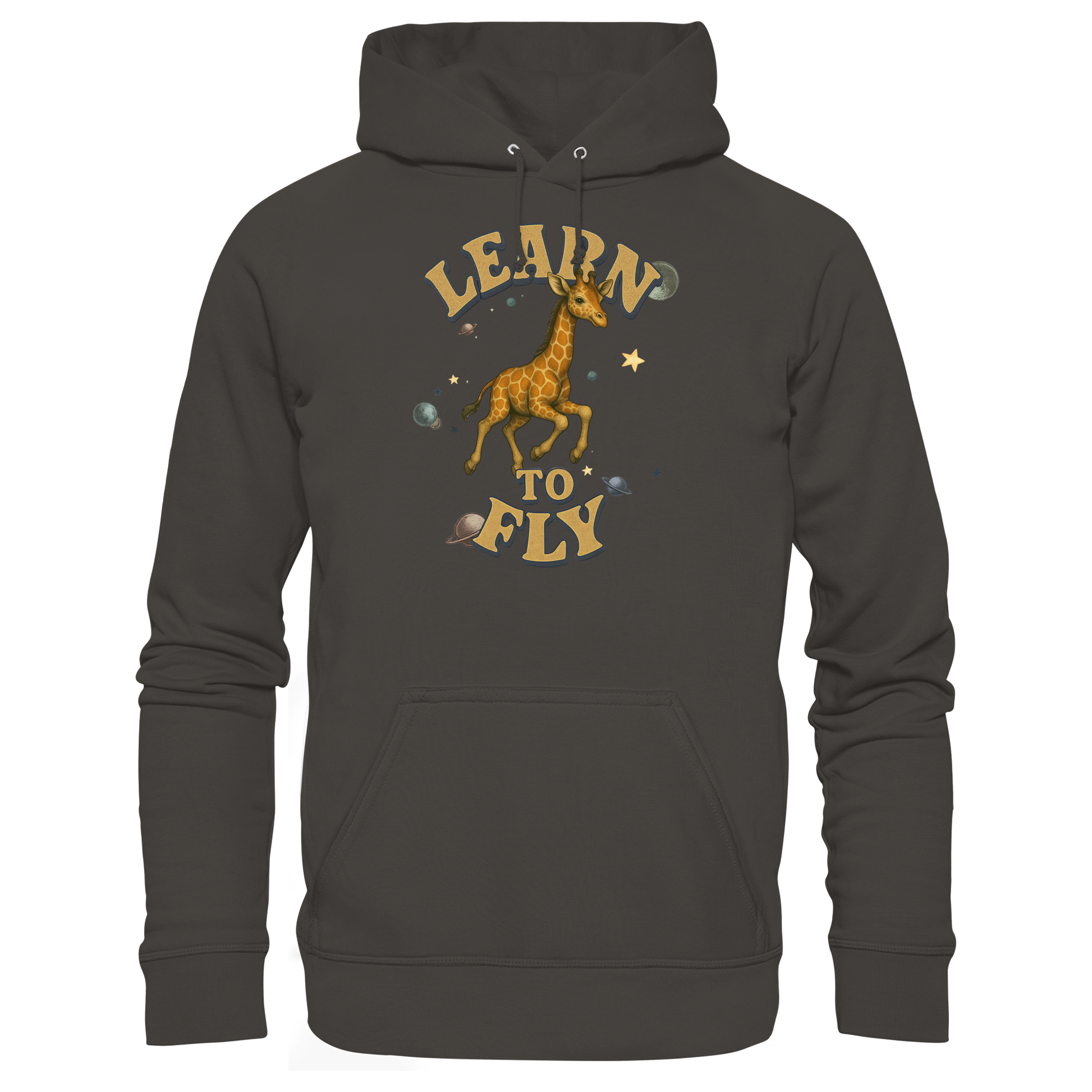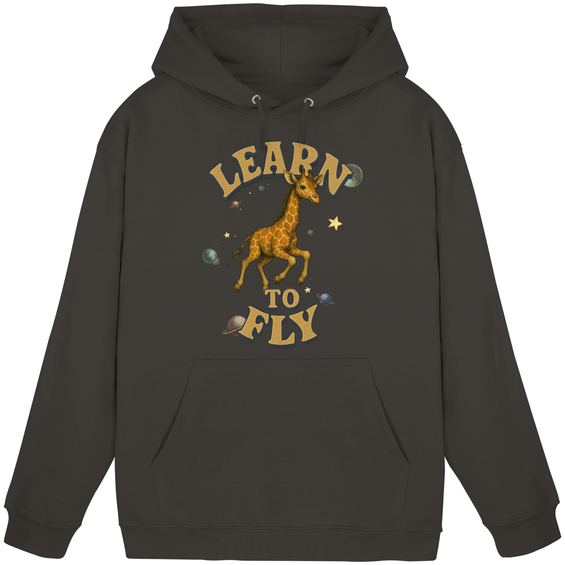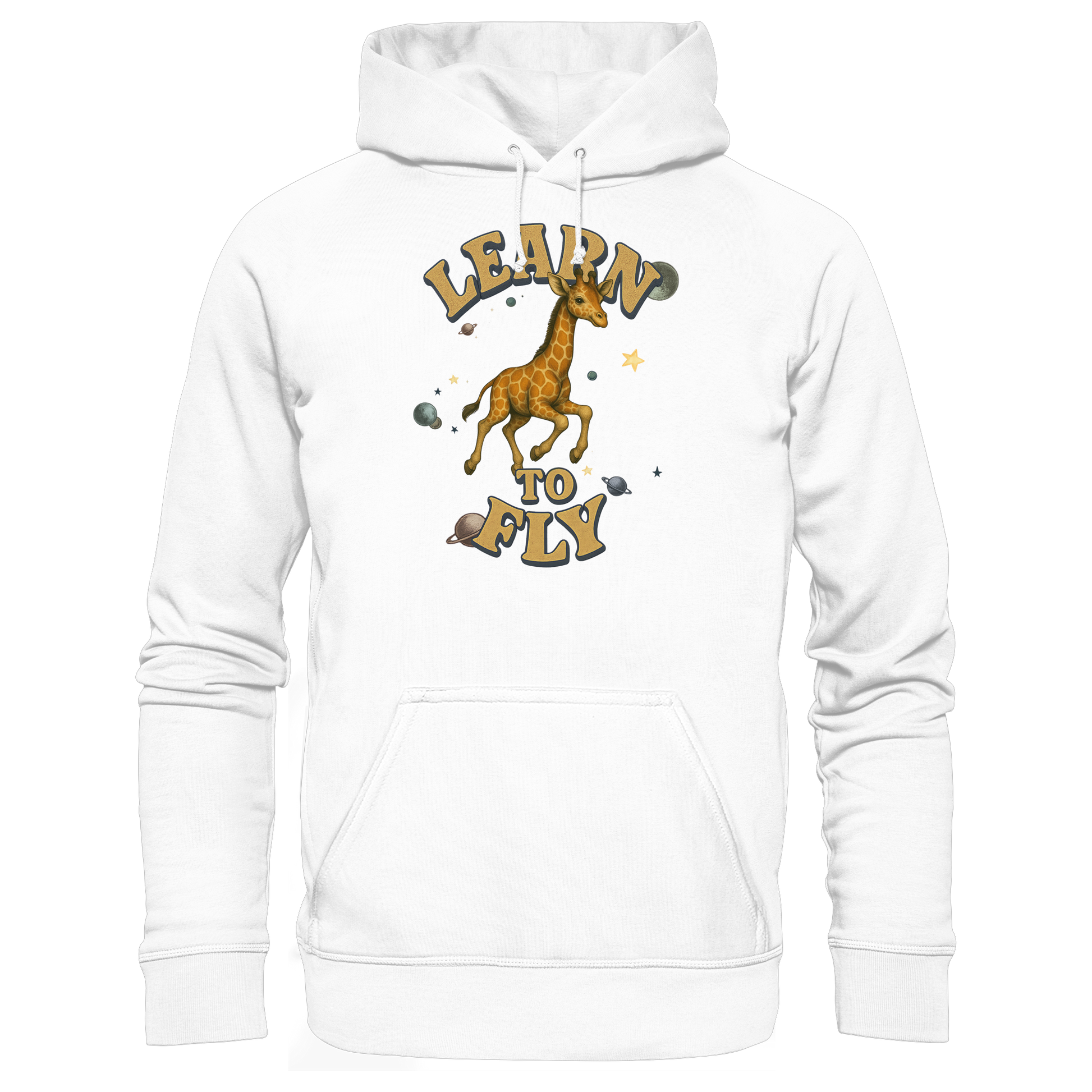 Eine Giraffe zwischen Sternen und Planeten – fliegen wird sie nie, doch genau das macht den Hoodie so stark. Learn To Fly ist eine Serie über Druck, Freiheit und Humor. Perfekt für alle, die auffallen wollen. Teil einer Kollektion mit weiteren Tiermotiven.