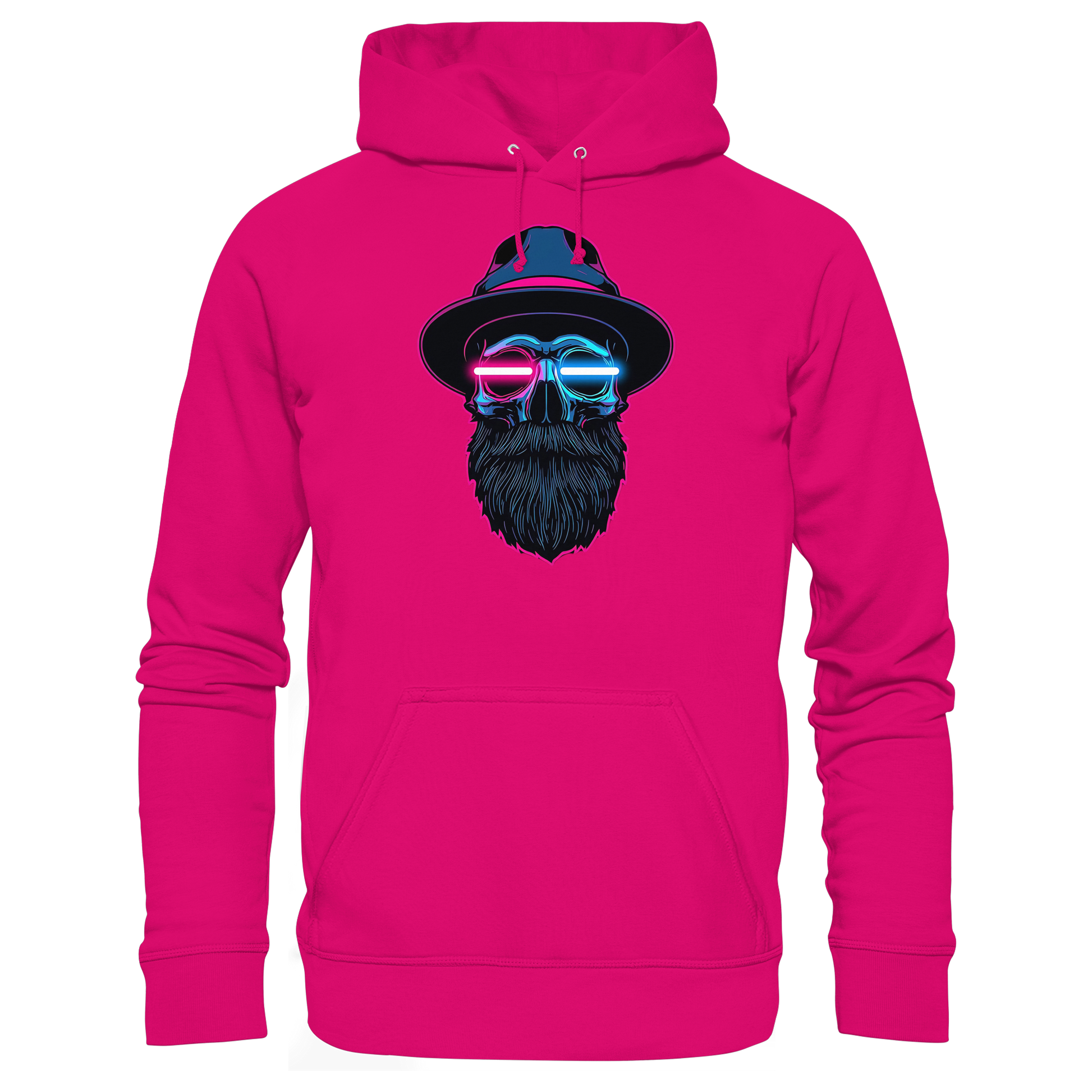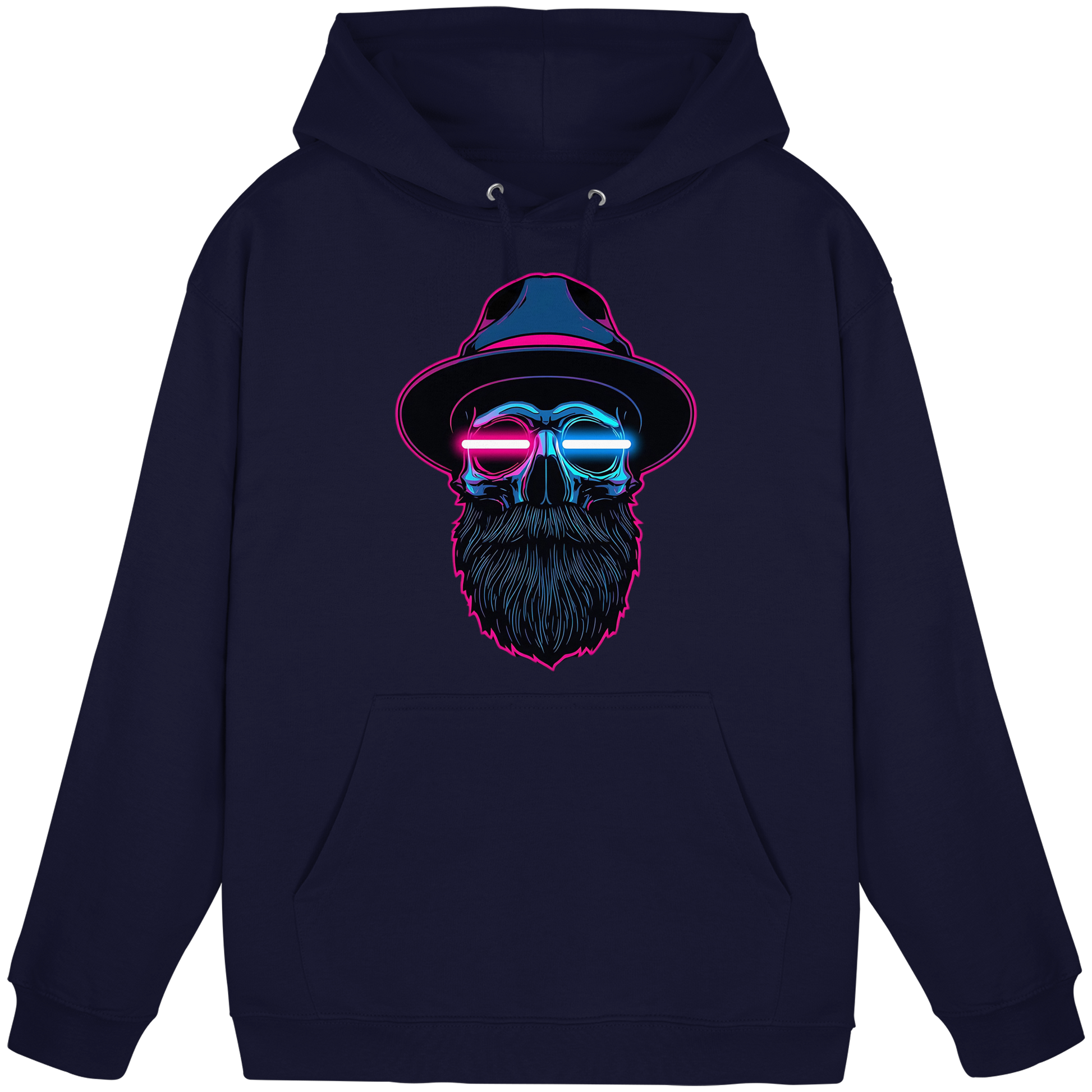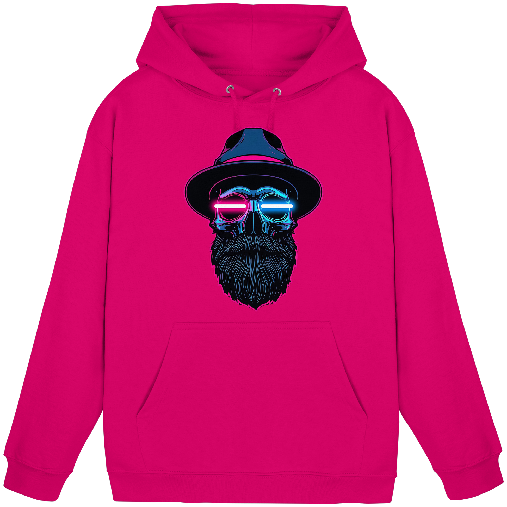 Ein ikonisches Hoodie-Design mit leuchtendem Totenkopf im Cyberpunk-Stil – perfekt für Raves, Clubs oder Streetwear-Looks.