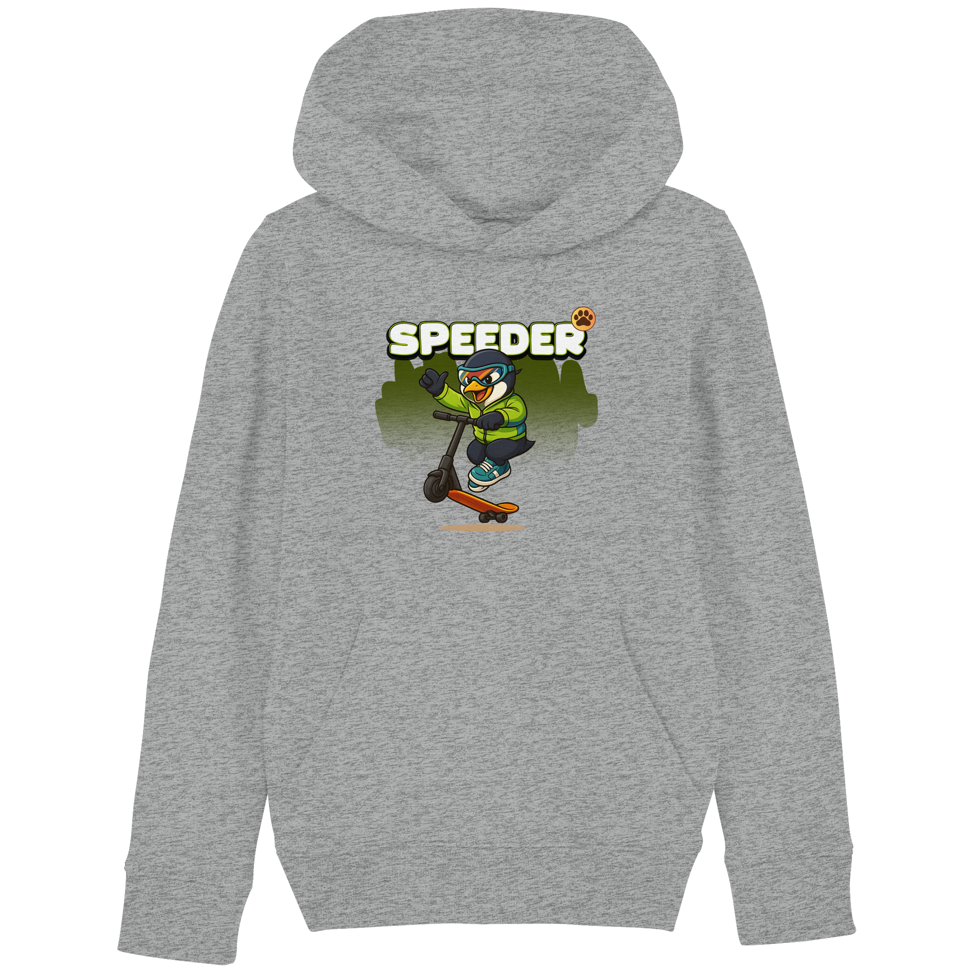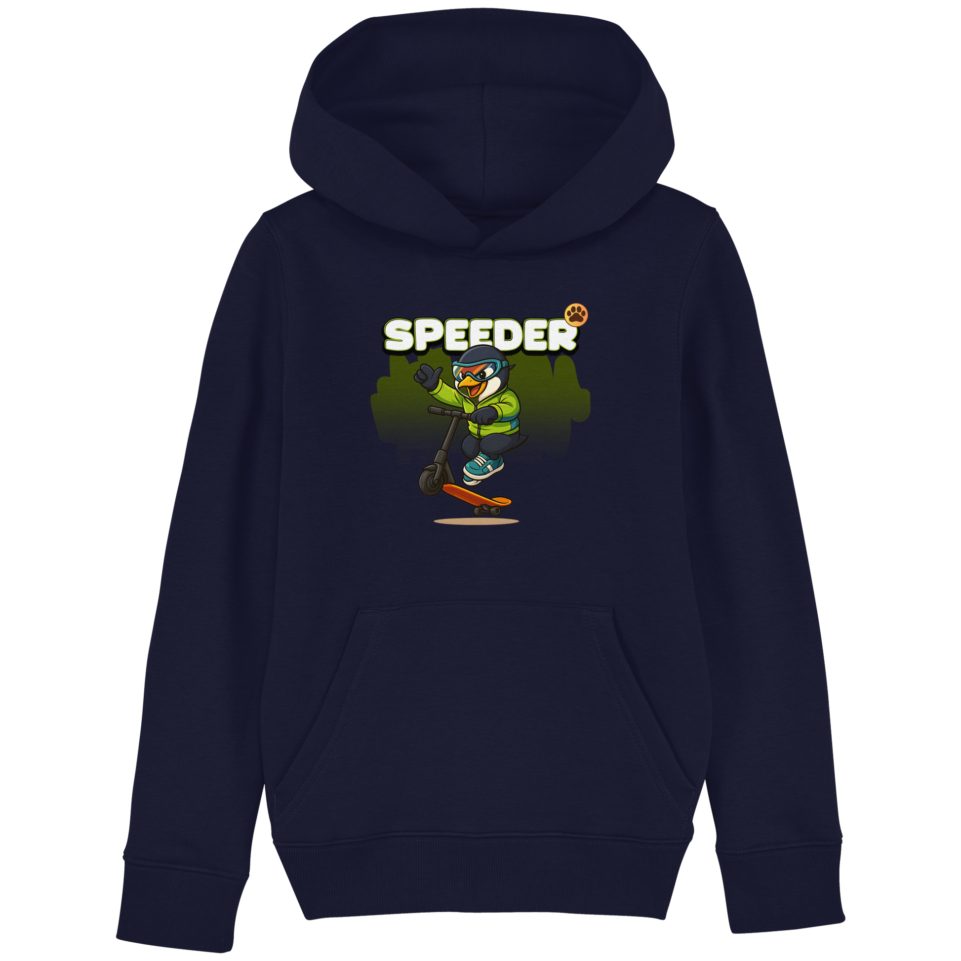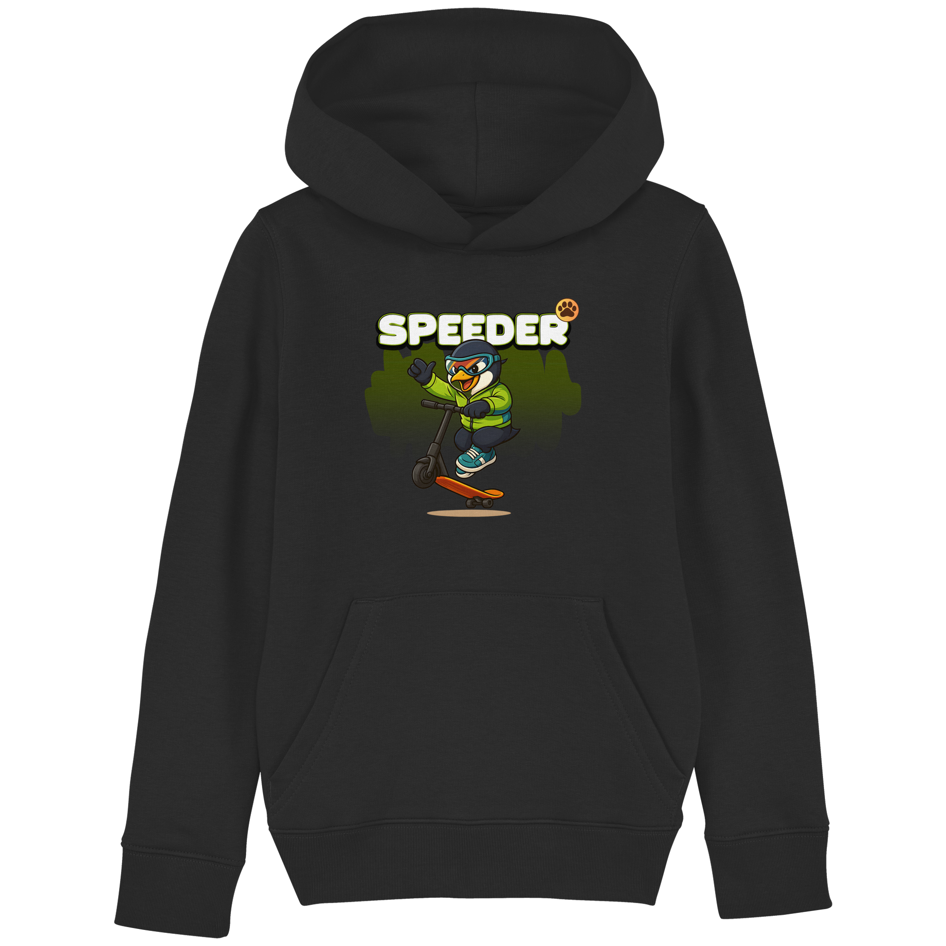 Mit dem Speeder Scooter Hoodie wird es rasant. Der Pinguin zeigt seine Moves auf dem Scooter und bringt Crew-Power auf die Straße. Bequem, stylisch und voller Energie.