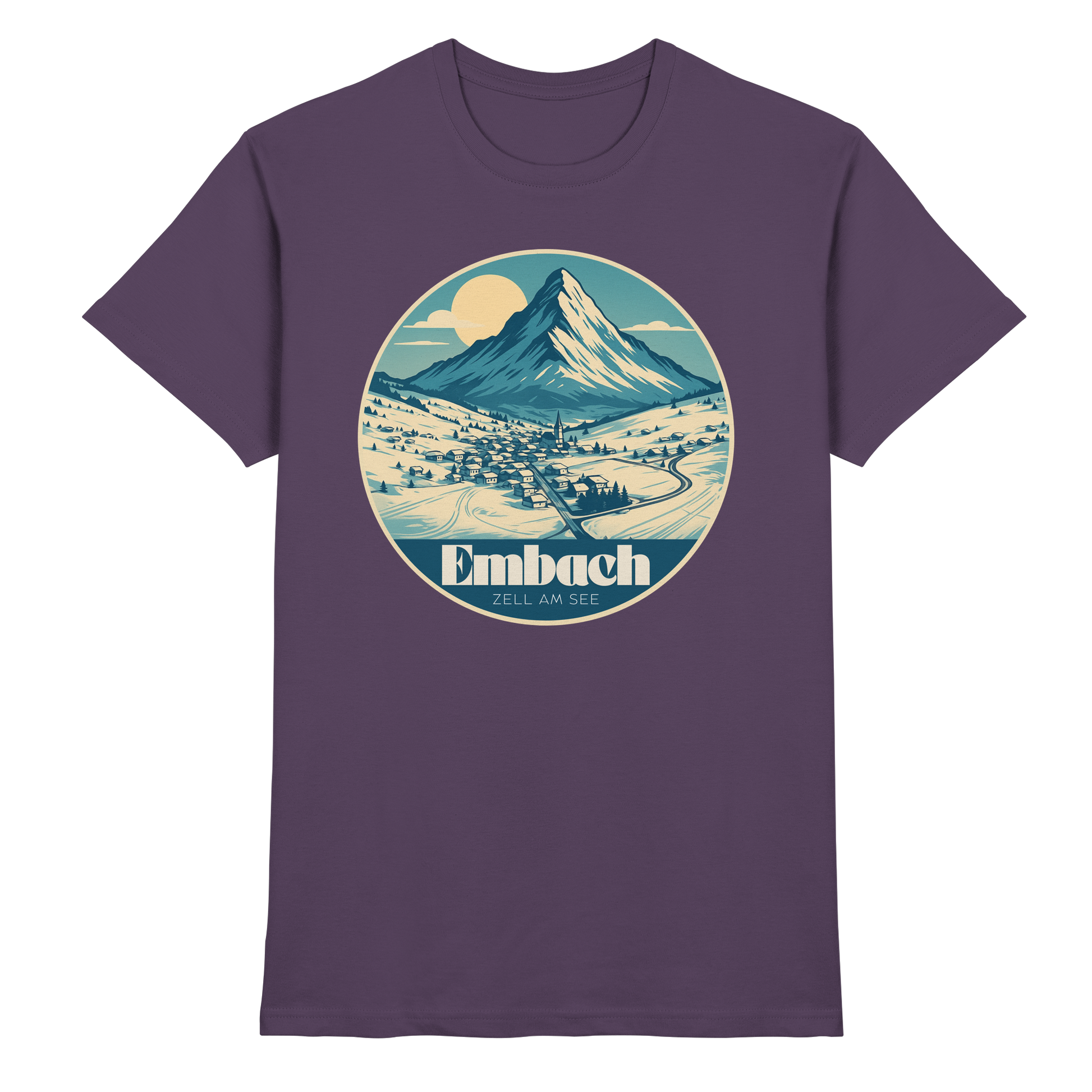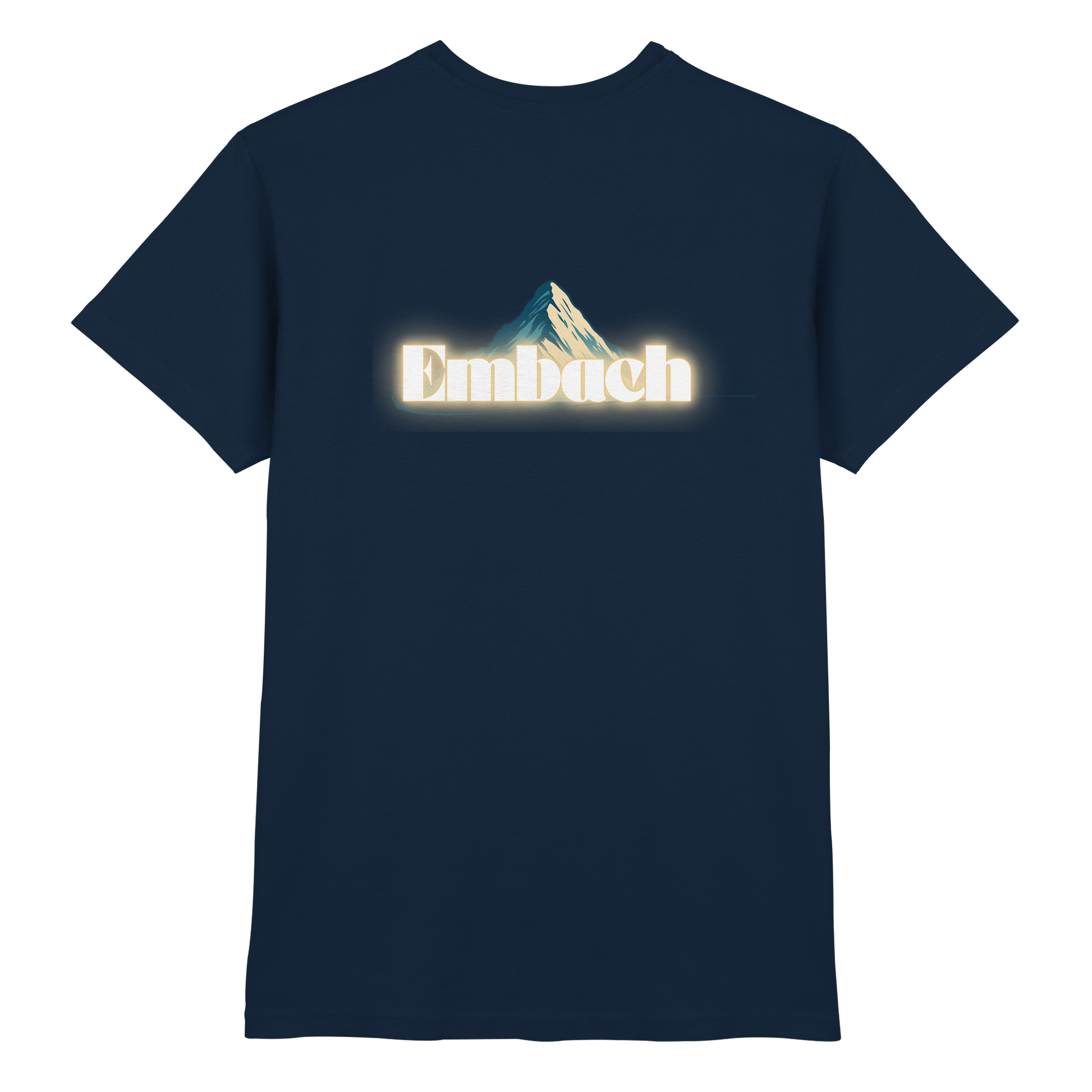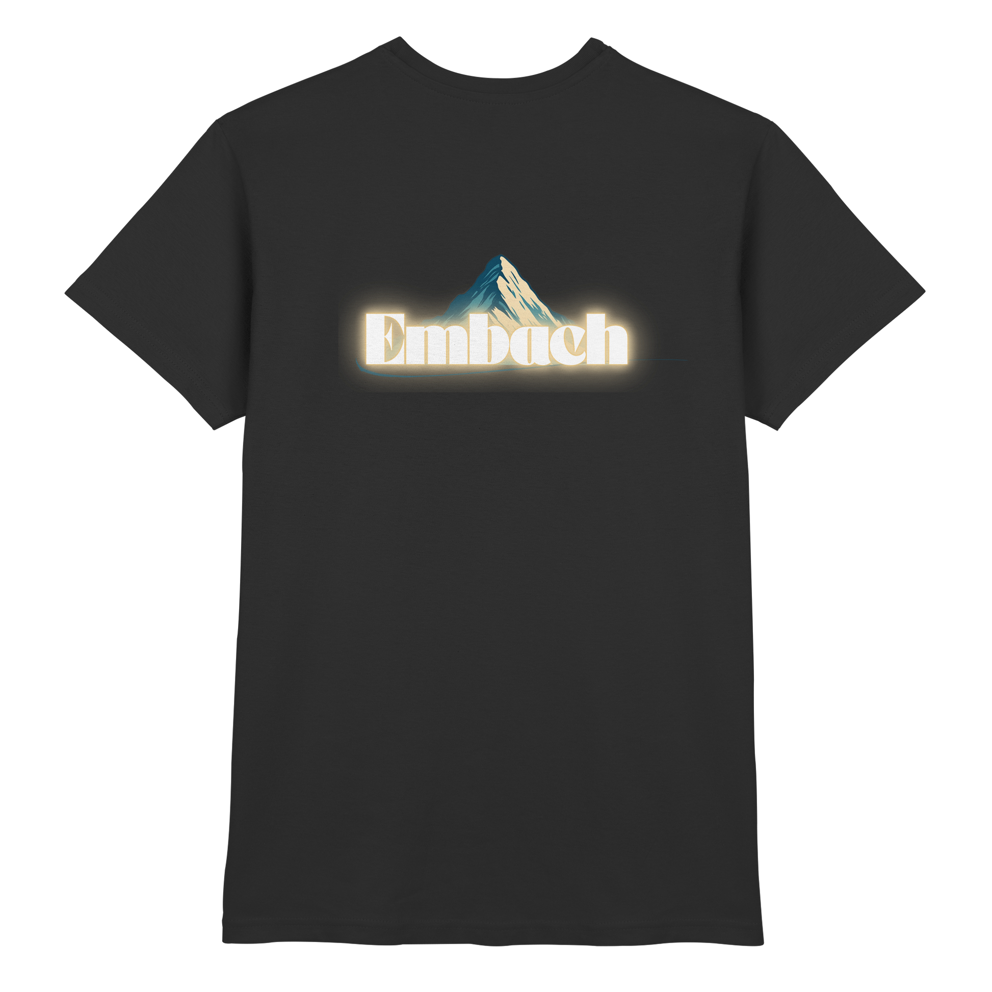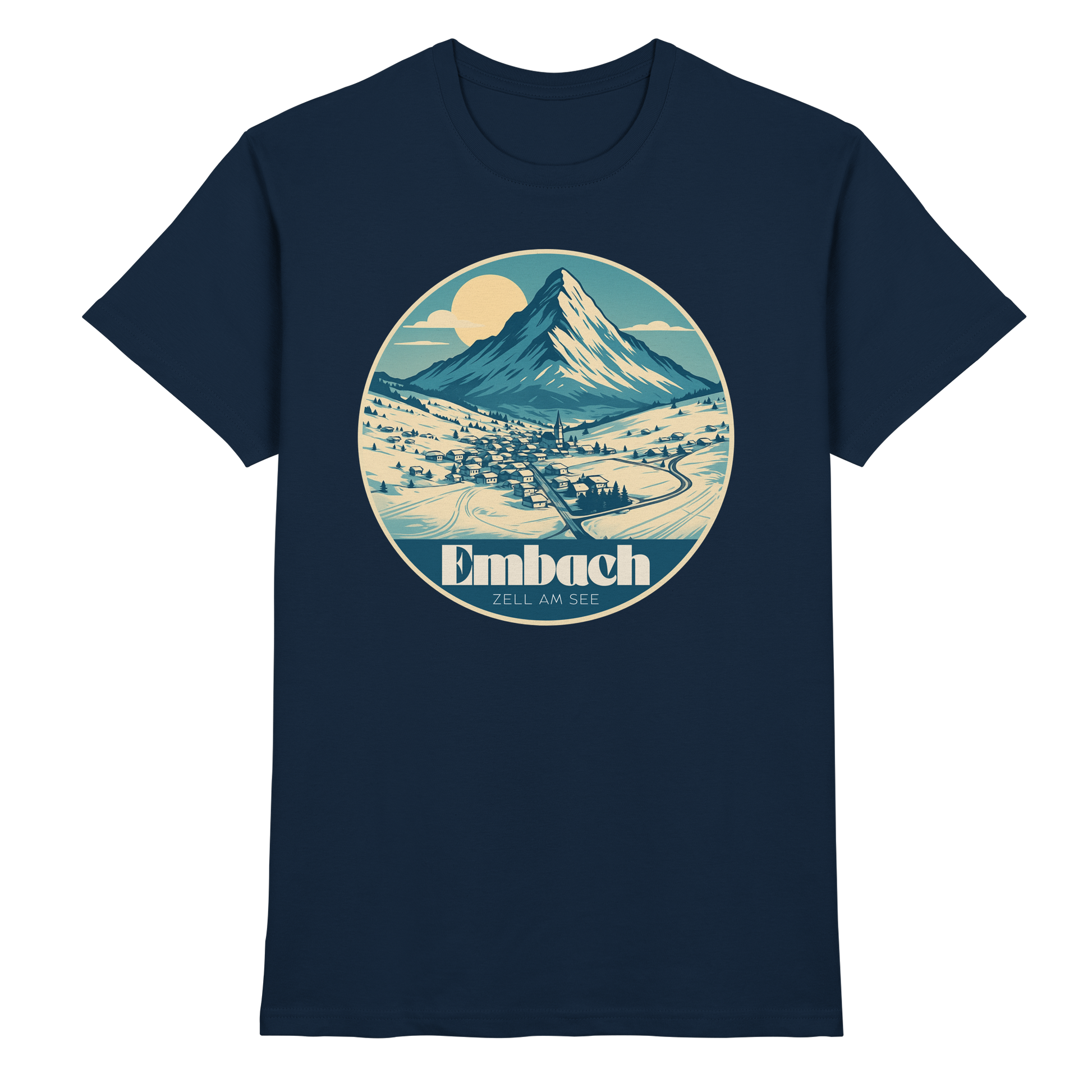 Dunkel, ruhig, stark – das „Winter Trail Dark“ Shirt zeigt vorne das verschneite Embach-Motiv und hinten den klaren Schriftzug mit Berg.