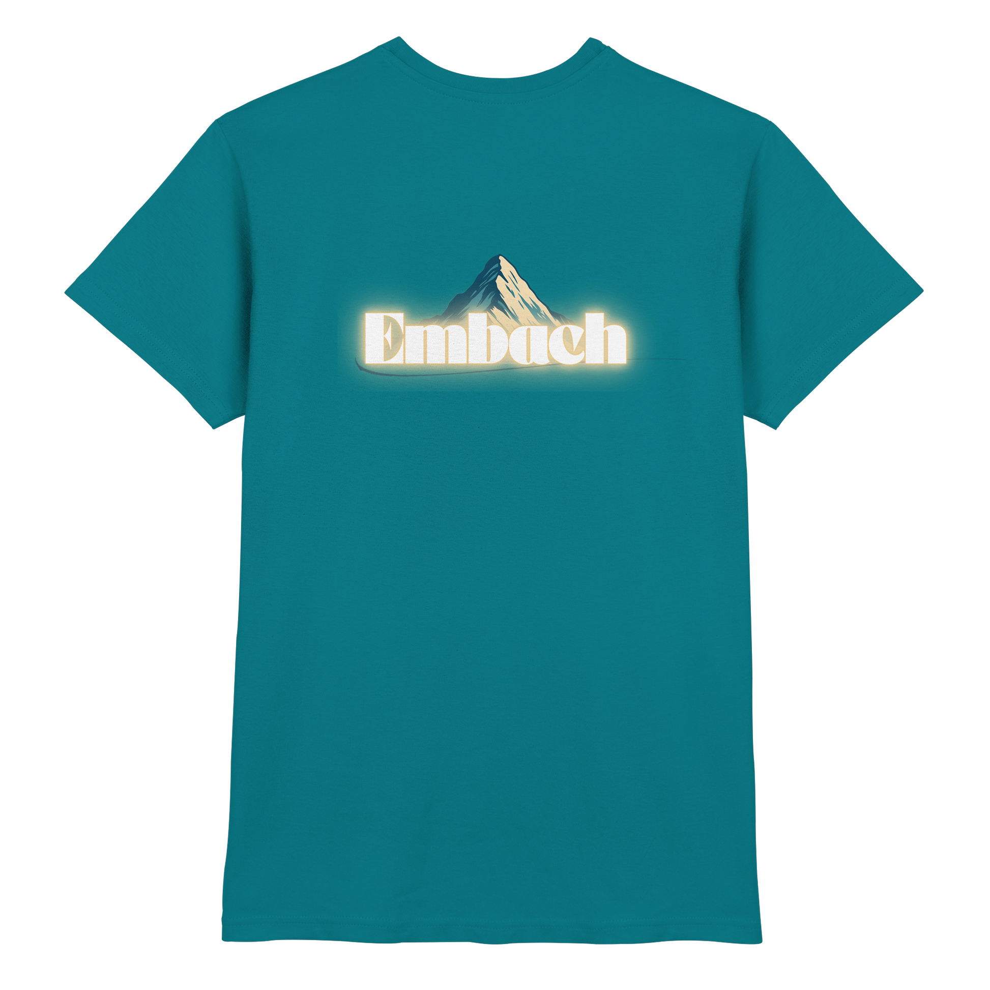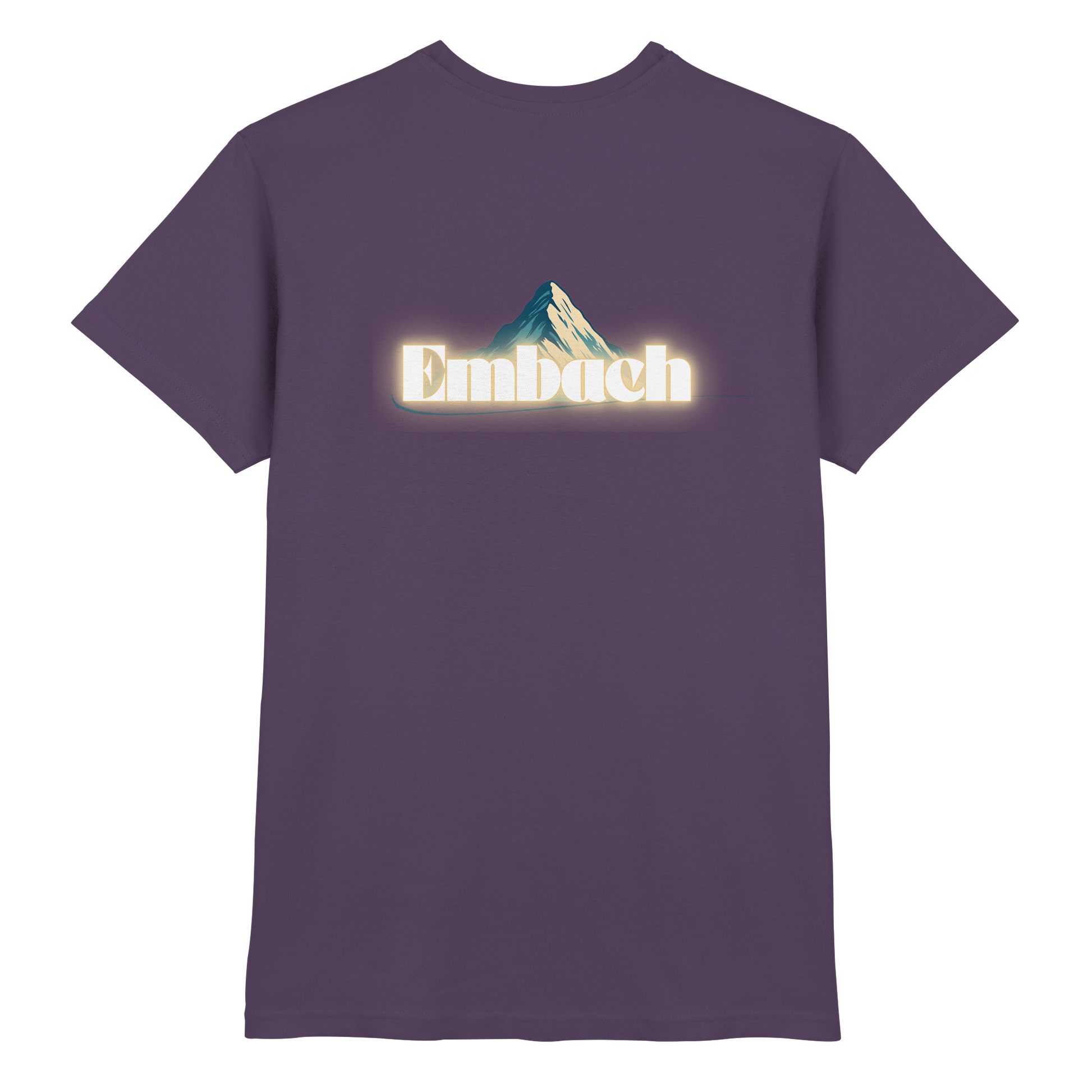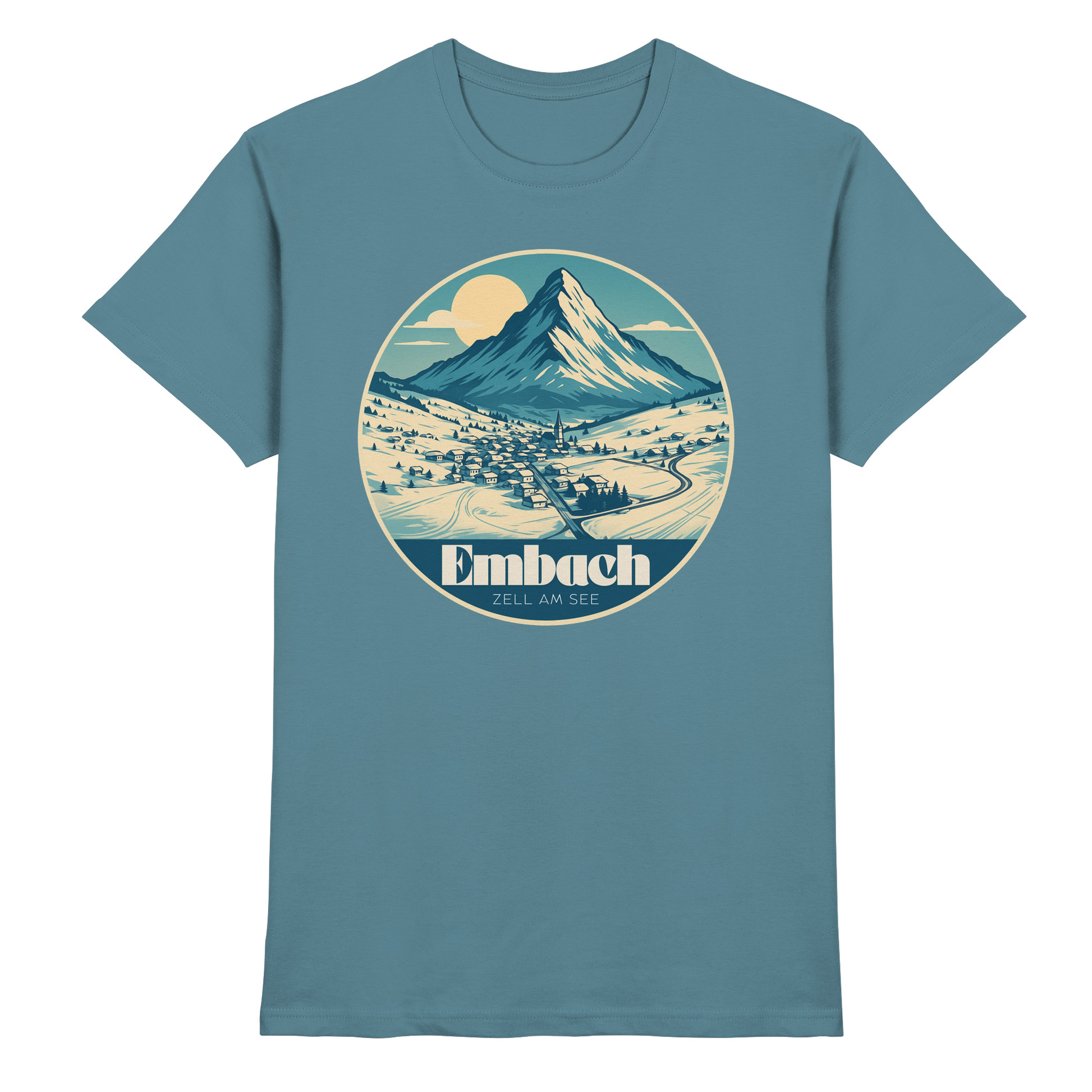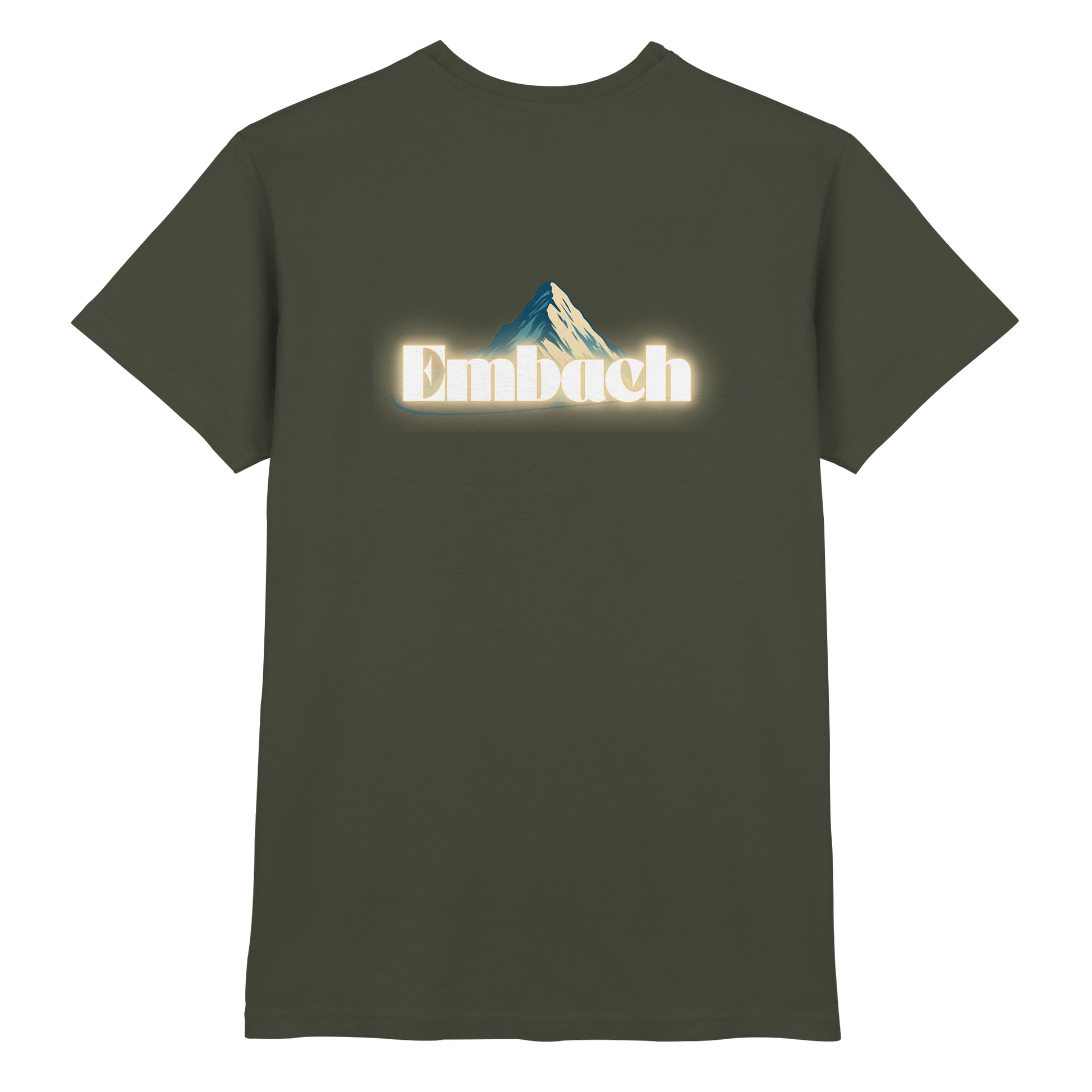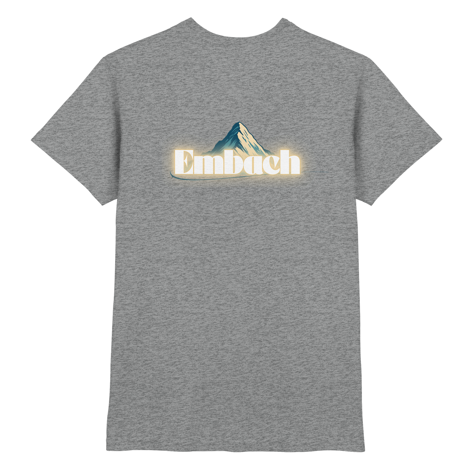 Dunkel, ruhig, stark – das „Winter Trail Dark“ Shirt zeigt vorne das verschneite Embach-Motiv und hinten den klaren Schriftzug mit Berg.