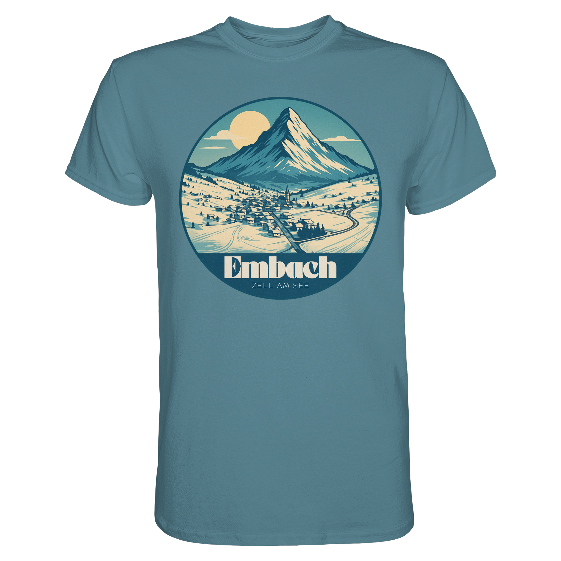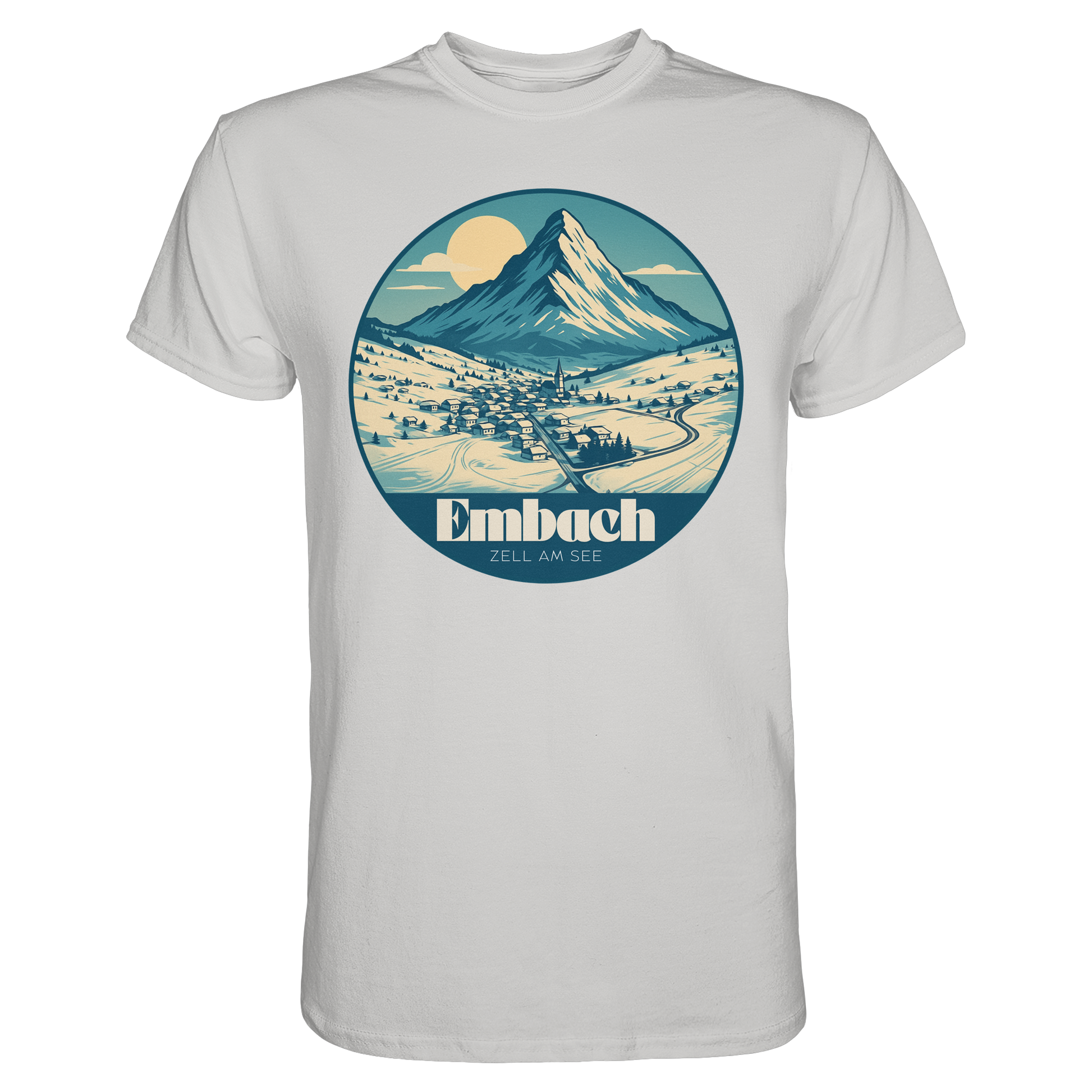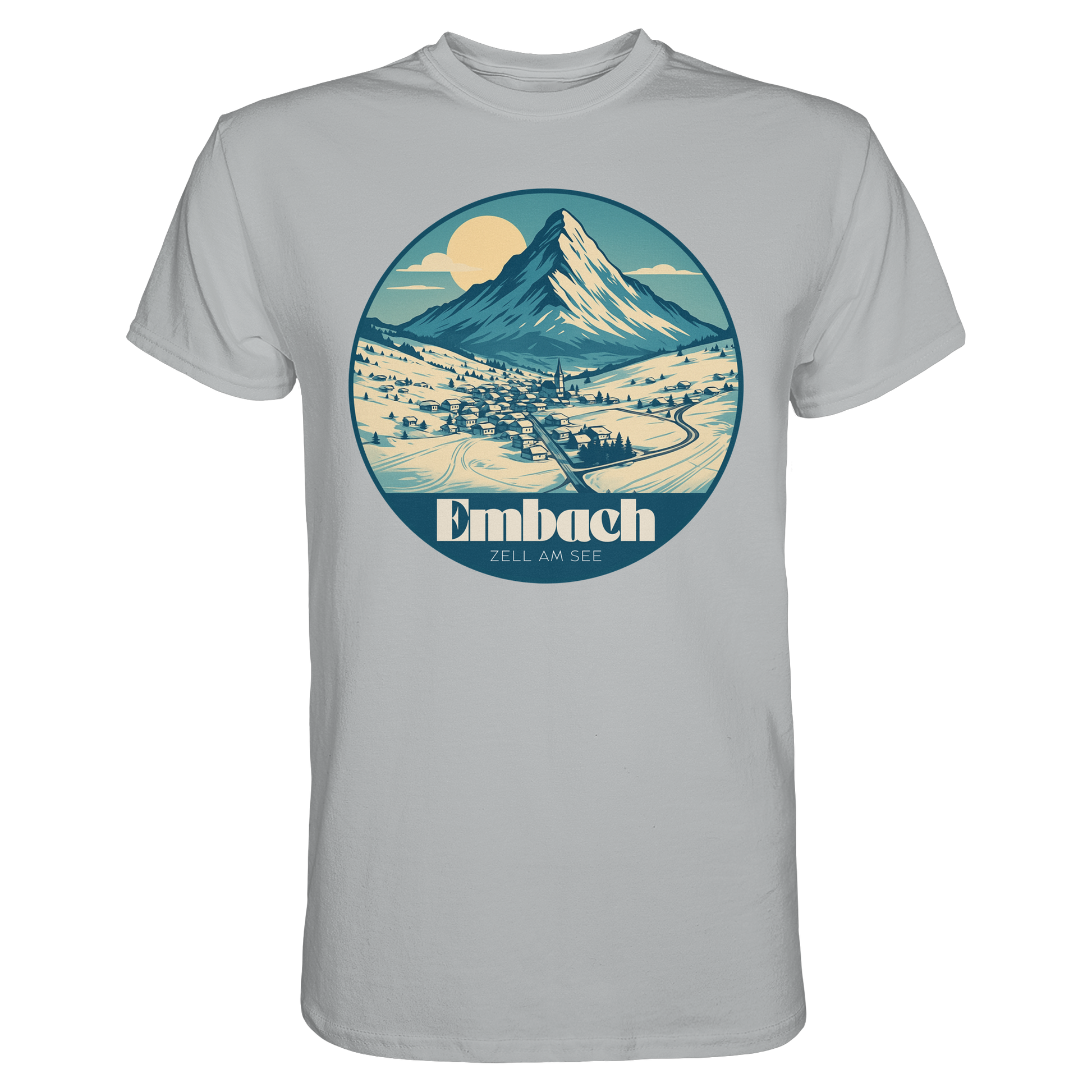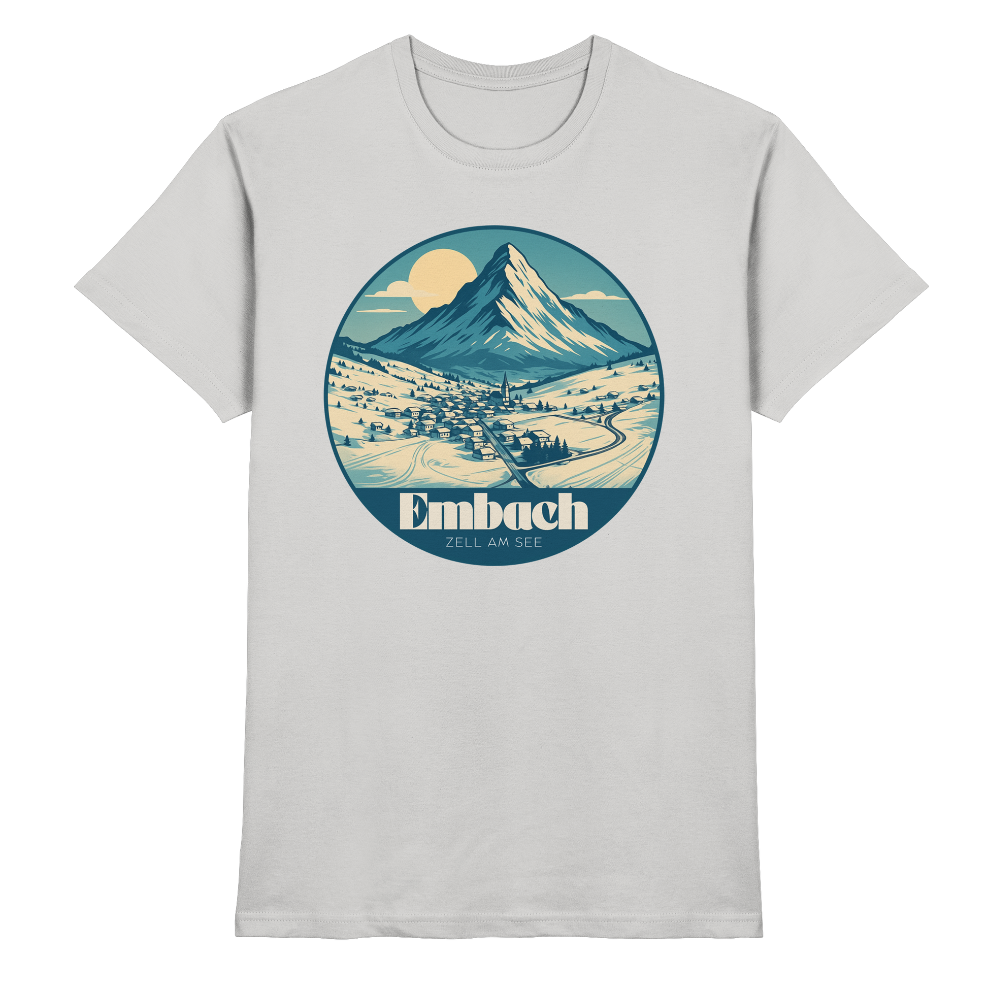 Vorne das verschneite Bergdorf, hinten der klare Schriftzug mit Berg – das „Winter Trail“ Shirt bringt Embach im Winter perfekt auf Stoff.
