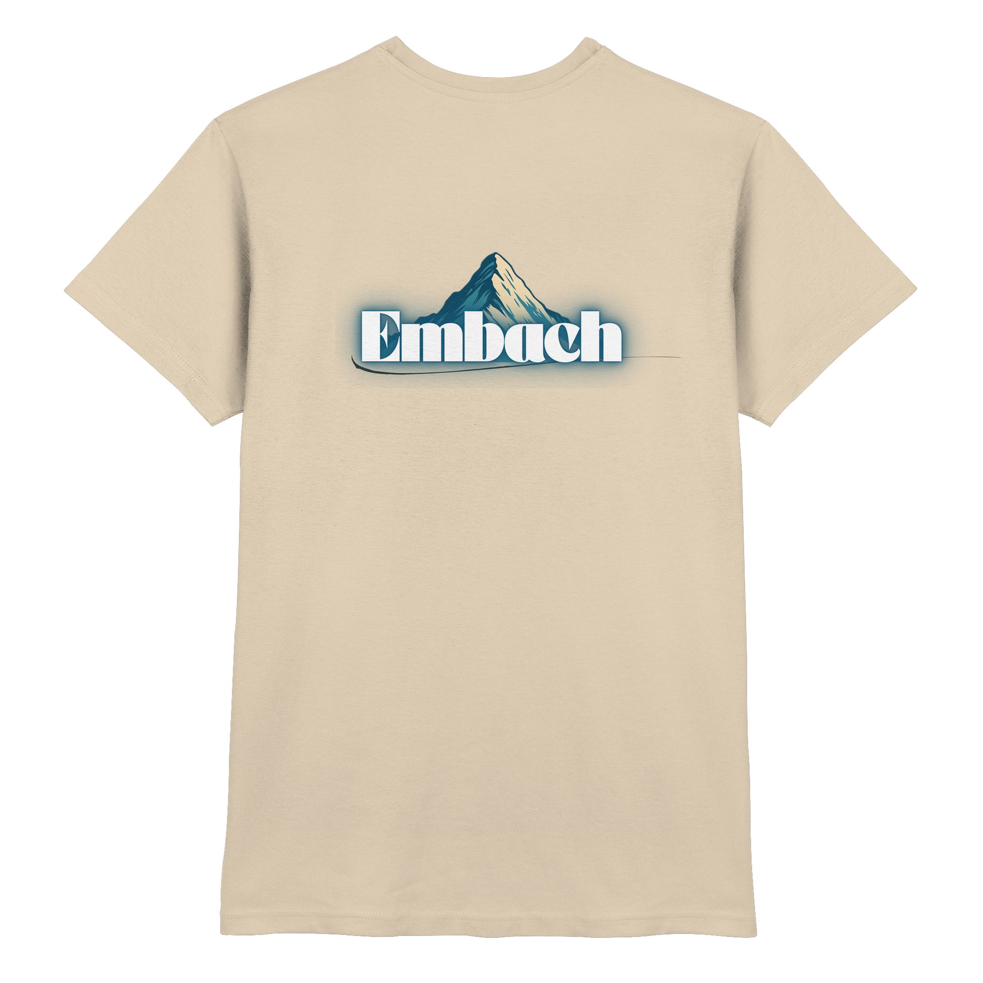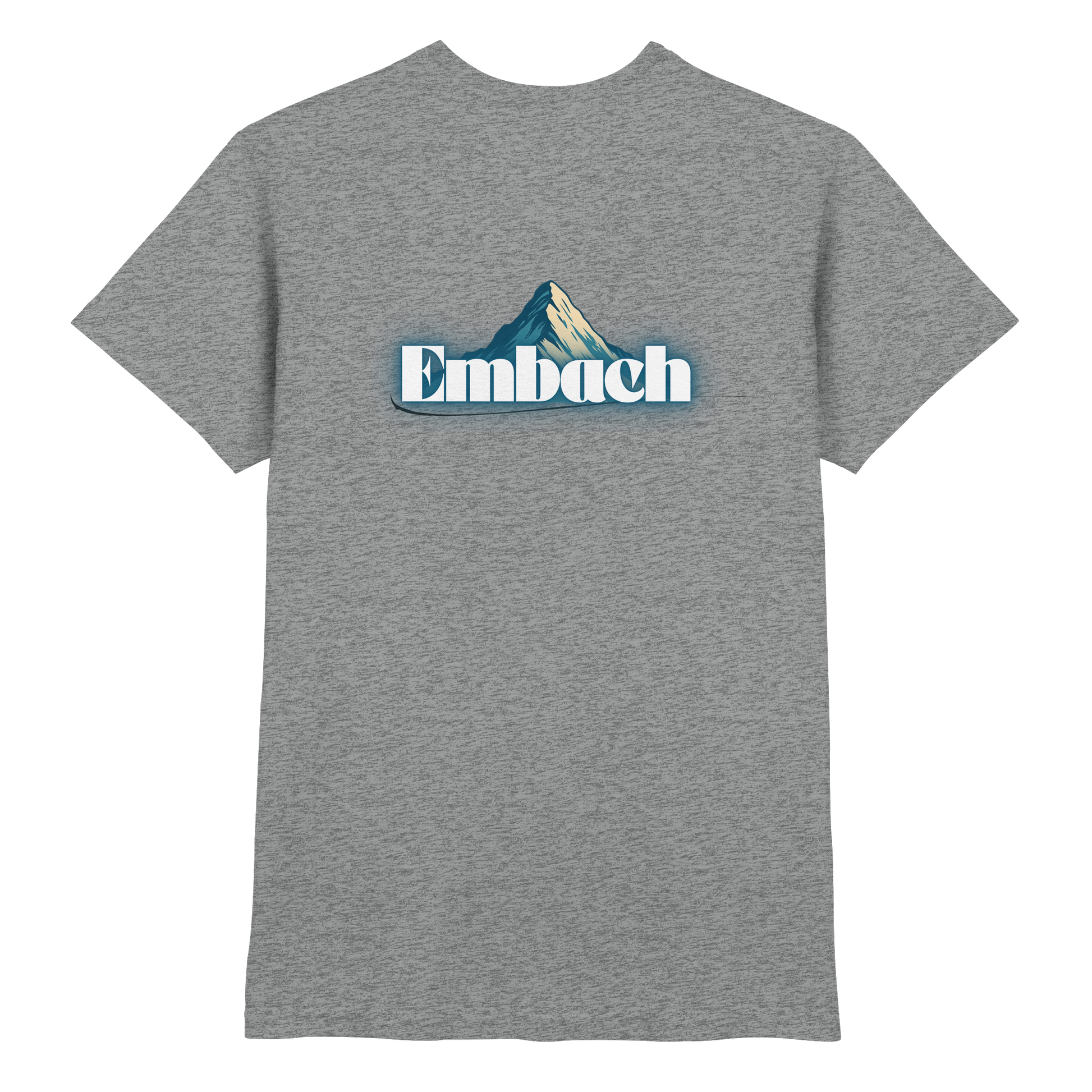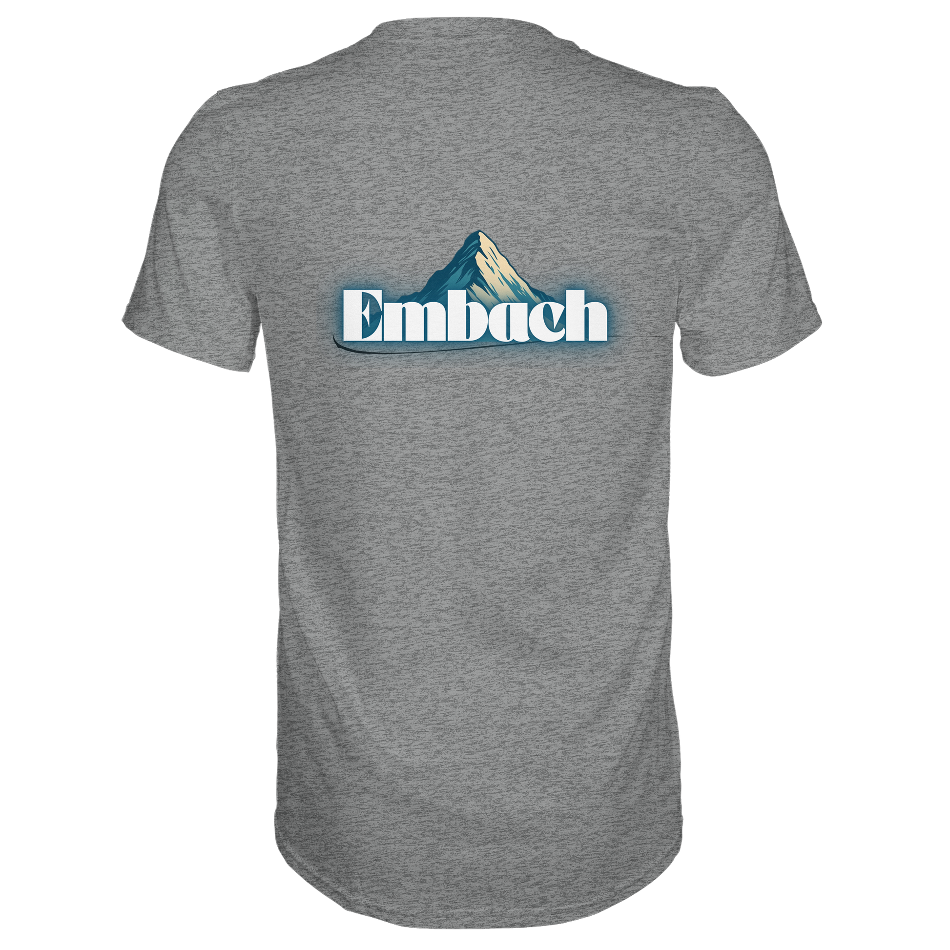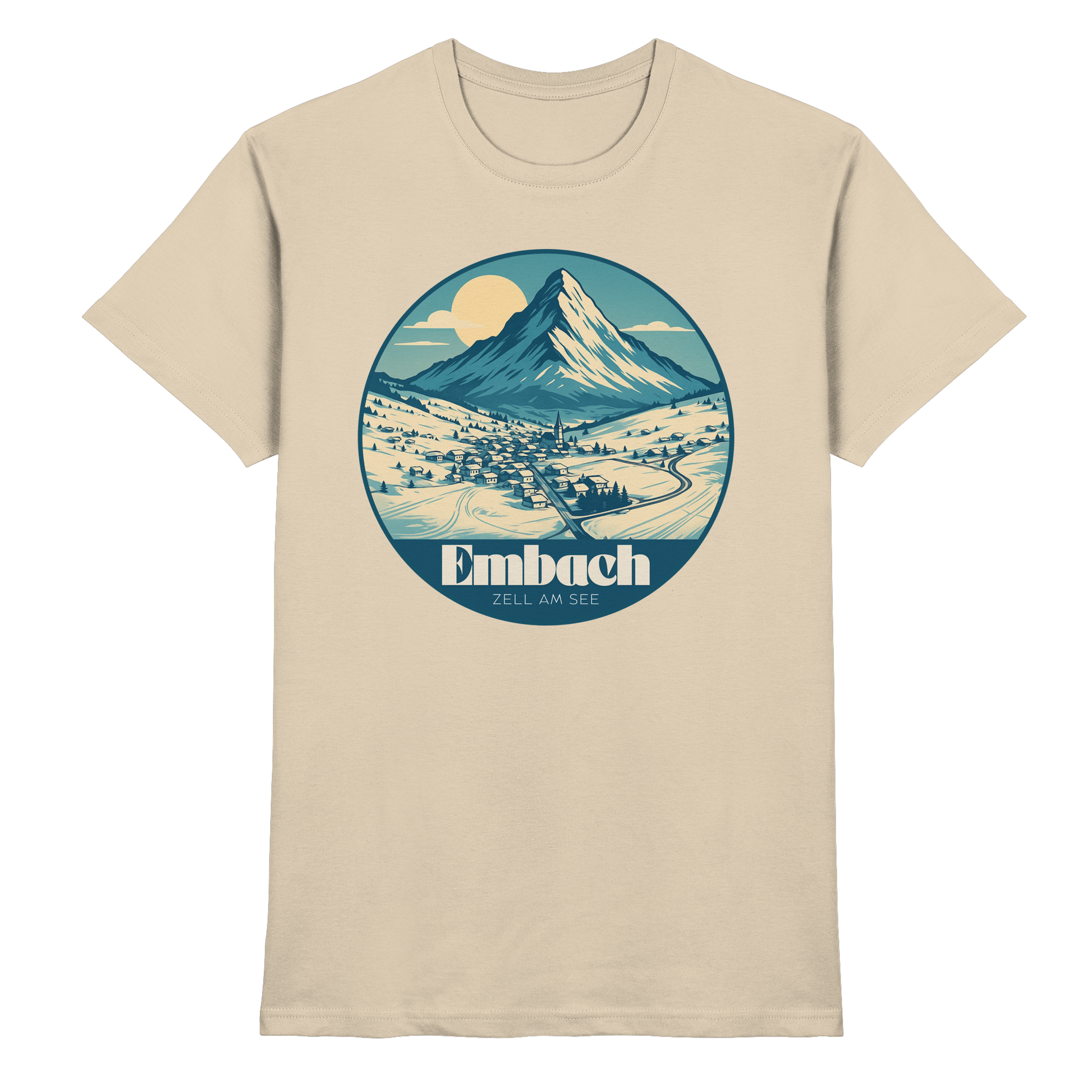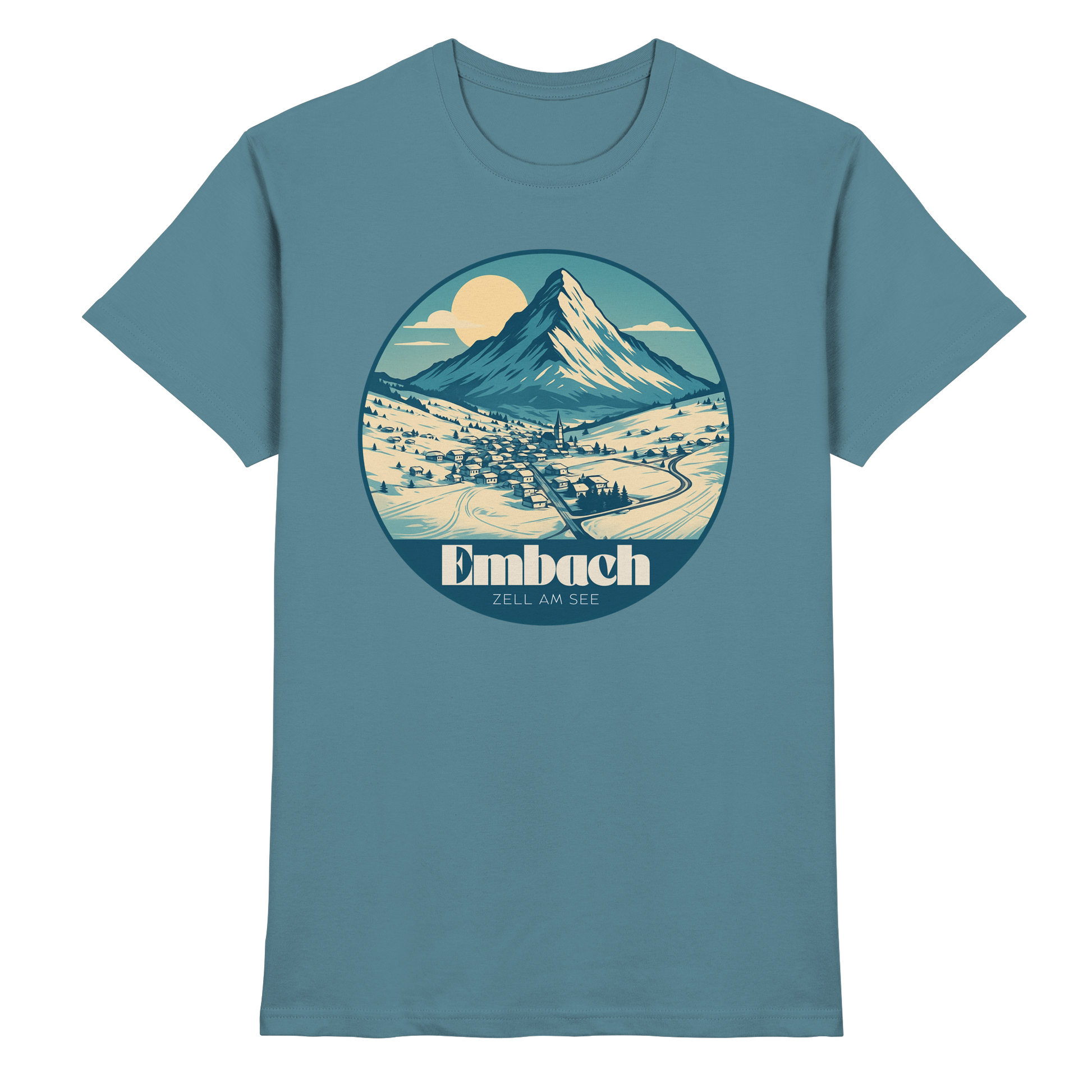 Vorne das verschneite Bergdorf, hinten der klare Schriftzug mit Berg – das „Winter Trail“ Shirt bringt Embach im Winter perfekt auf Stoff.